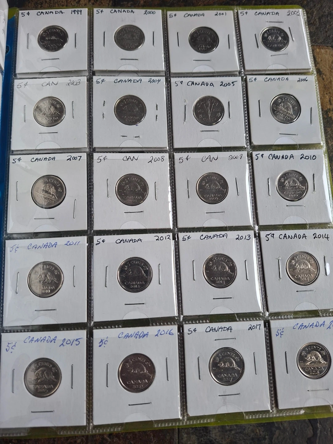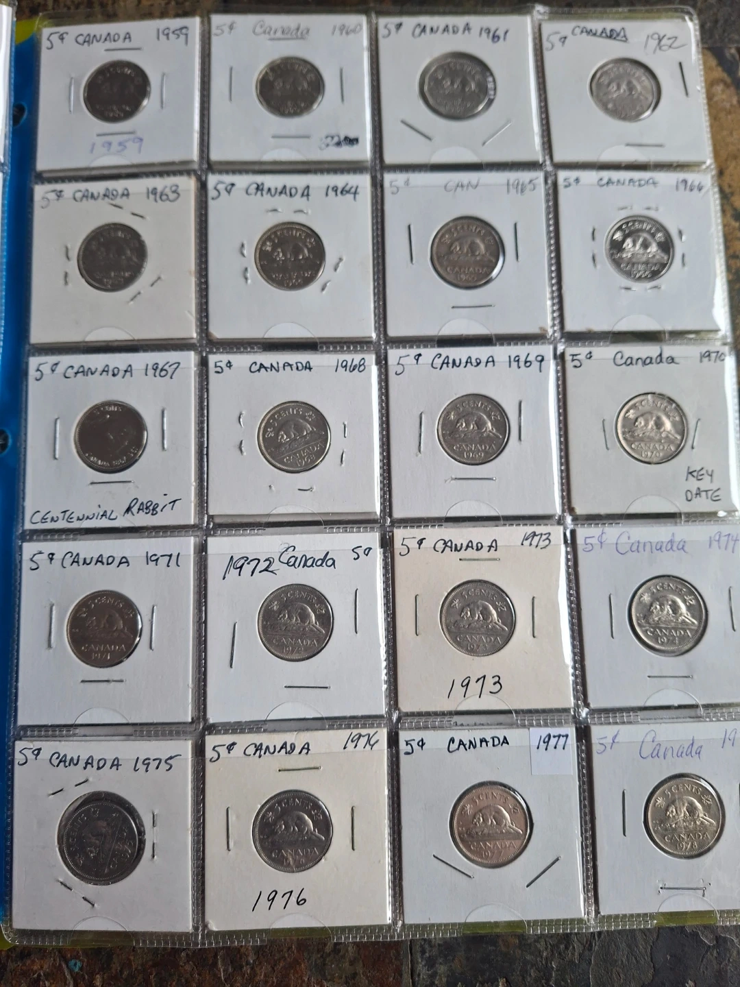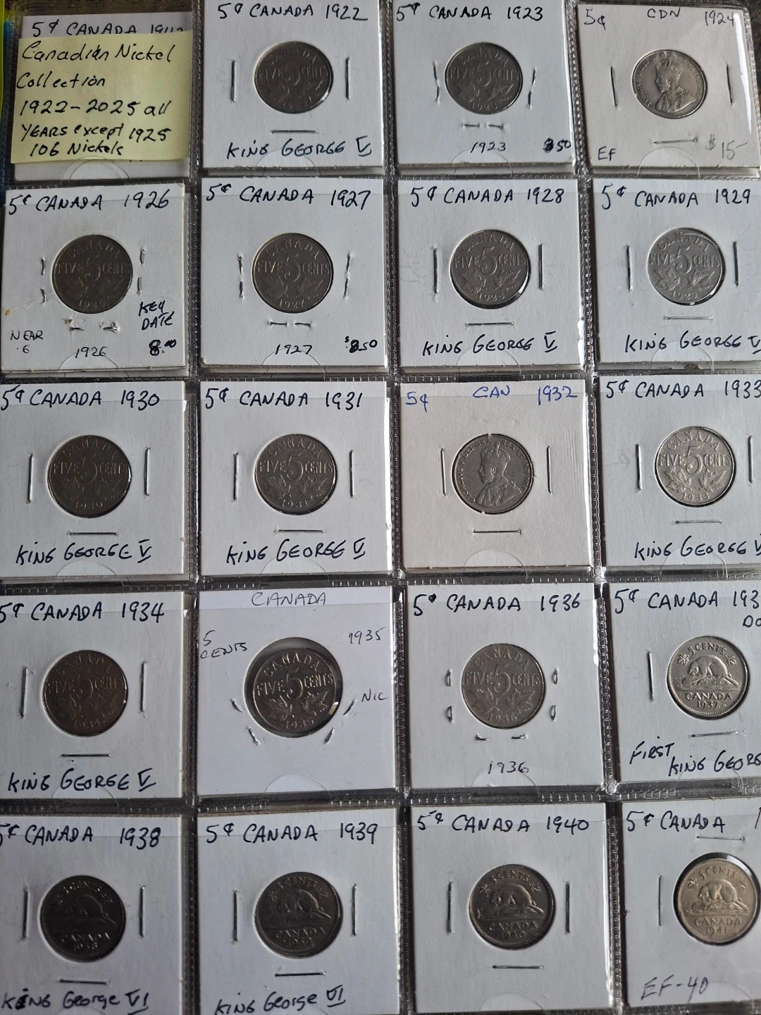 This collection includes 5-cent Canadian nickels from 1922 to 2025, with all years represented except 1925. It contains over 106 nickels in total. This is a great set for coin collectors! All coins are housed in protective sleeves.