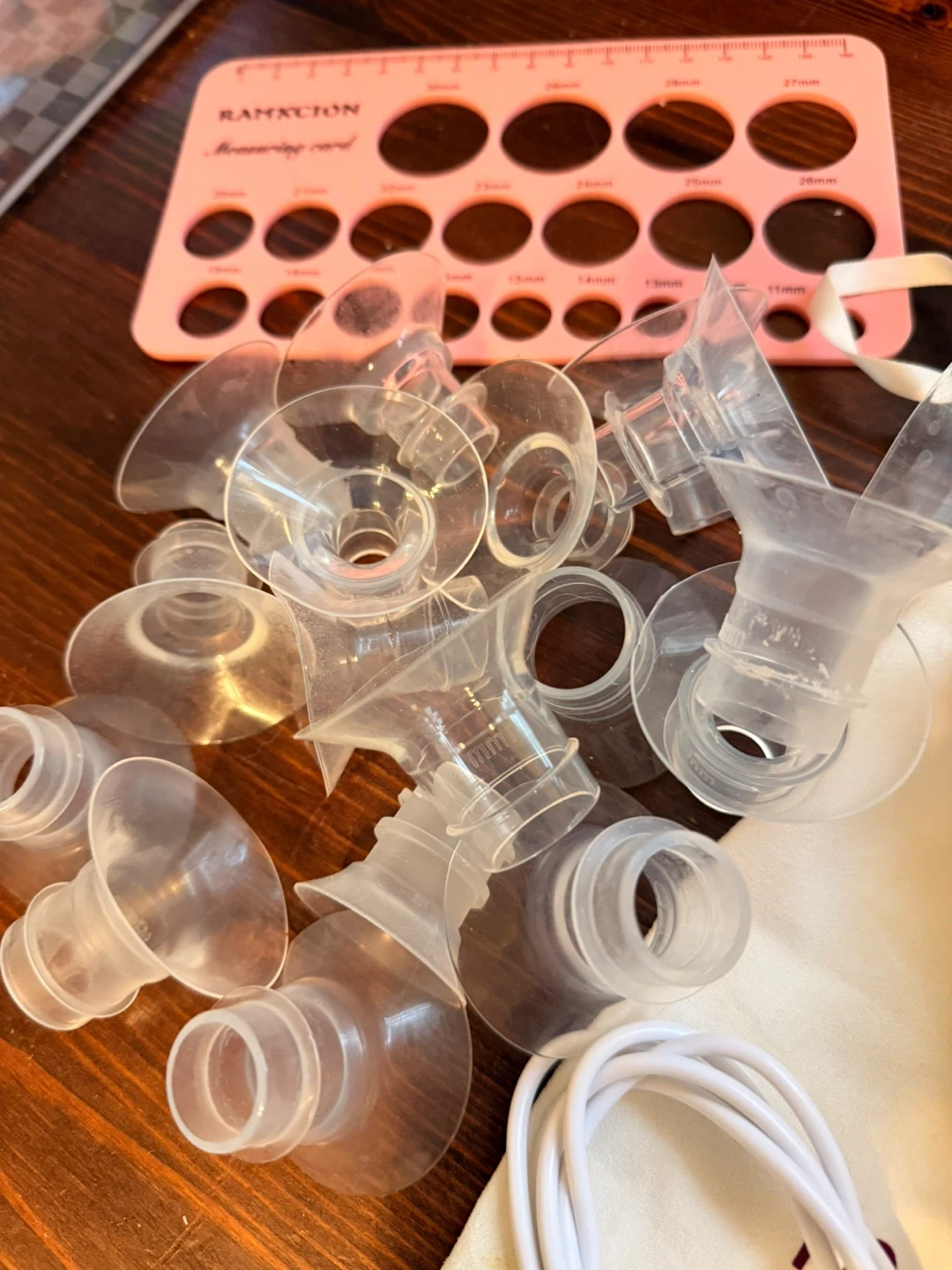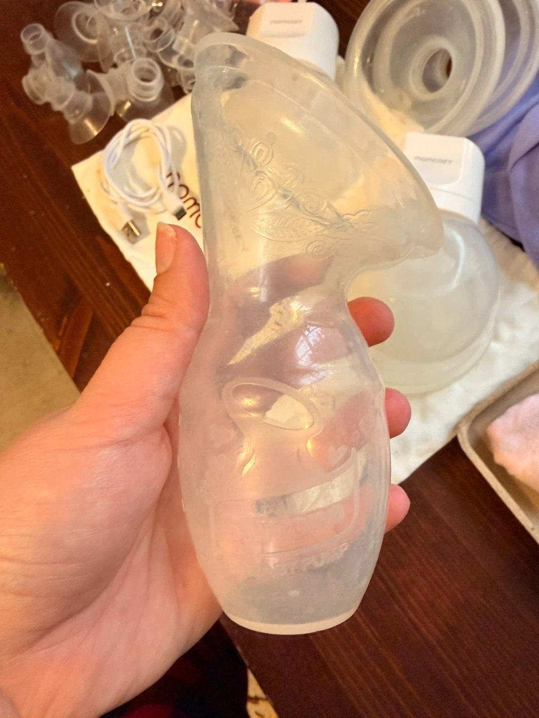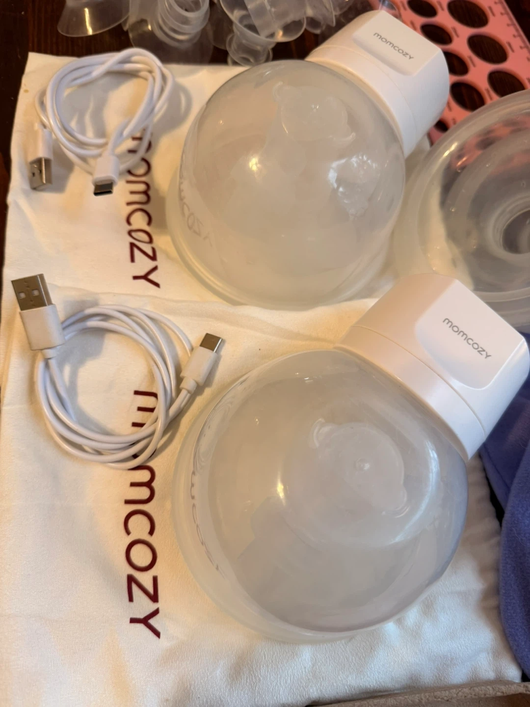 Momcozy double electric breast pump, comes with two bottles and charging cables. Includes 24 and 27 mm flanges as well as several extra flange inserts with nipple ruler. Includes haaka, two Lansinoh gel packs (can be used hot and cold), and one wart man’s booby tube. All items posted are included and work without issue.