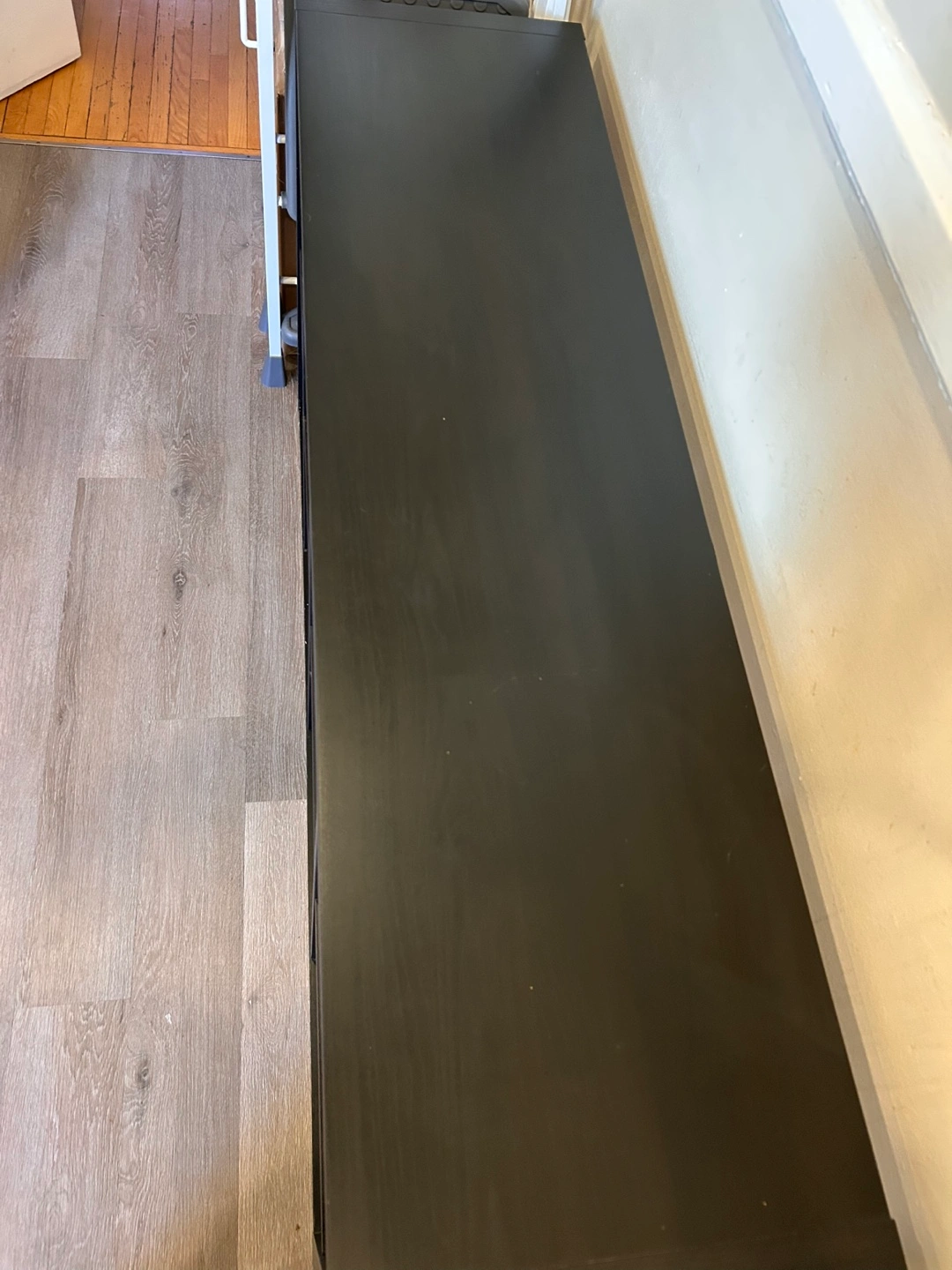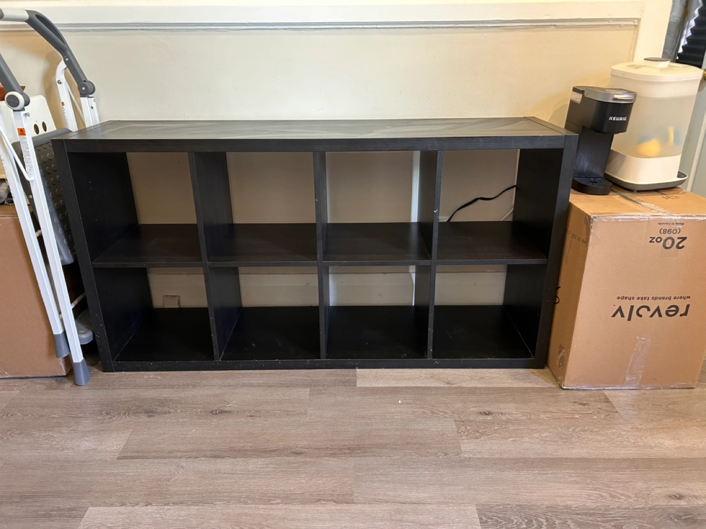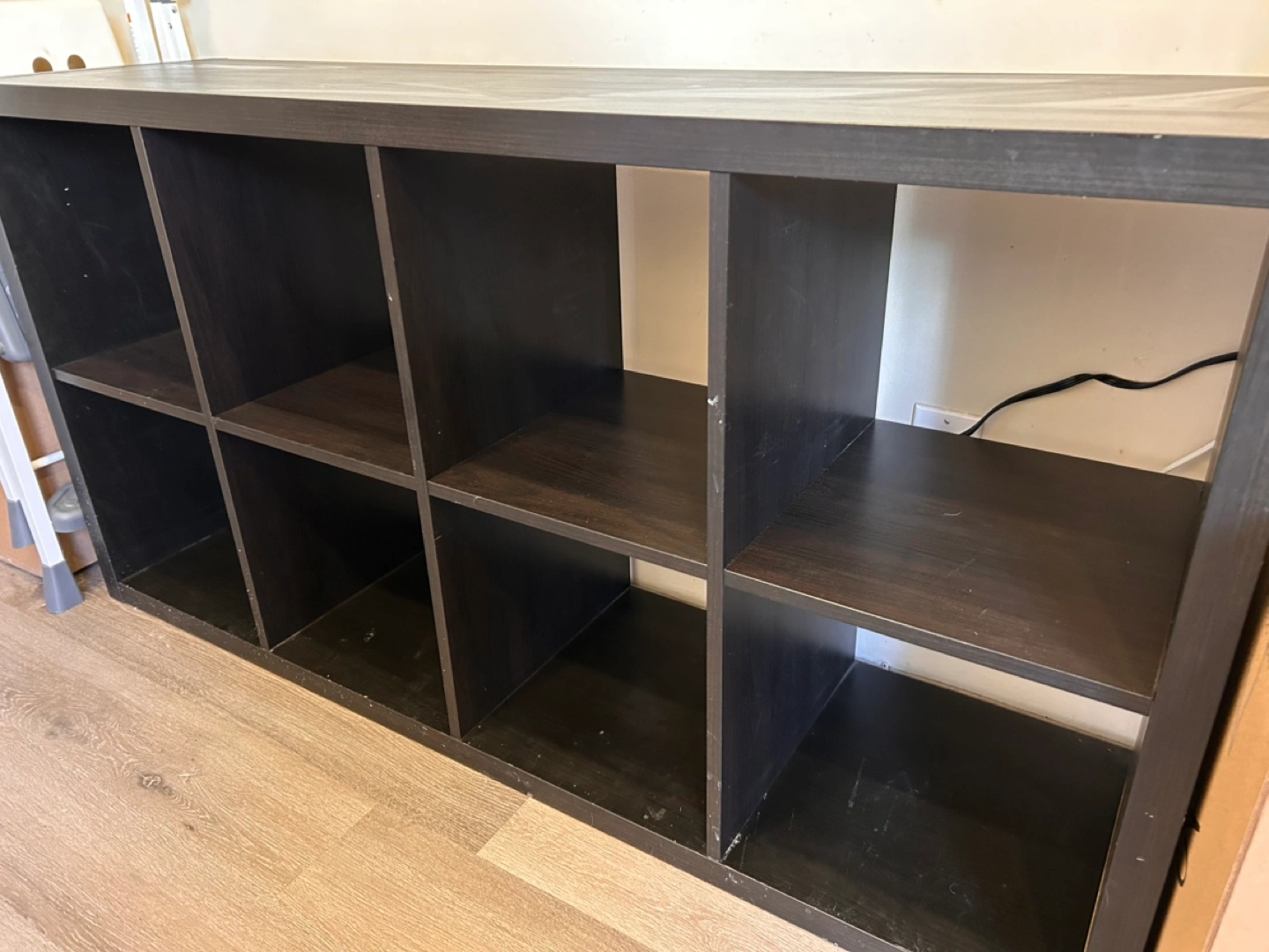 Nine-cube organizer. Dark brown/black finish. Good for storage, organization, or display. Some minor wear.