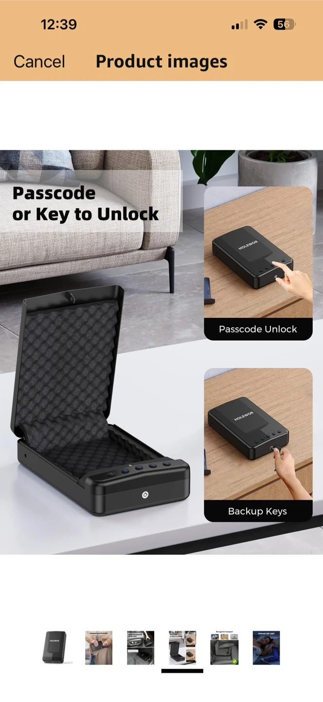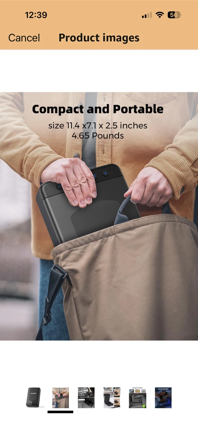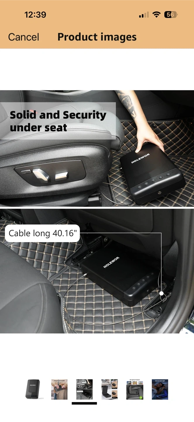 This HOLEWOR security safe box offers passcode or backup key access. It features an internal LED light for visibility. The cable measures 40.16 inches long and it's designed for under-seat storage. It's useful for securing valuables during transport.
