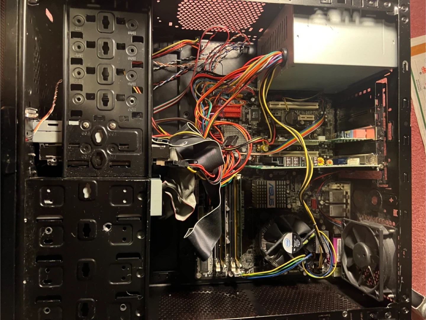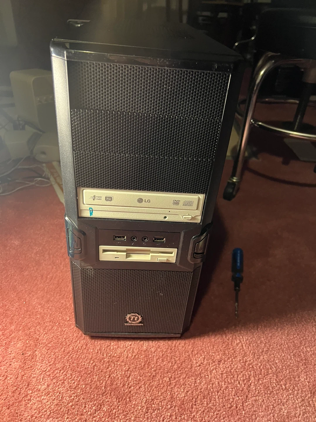 This is a black Thermaltake computer tower case. It features an LG CD/DVD drive and a floppy drive. Plenty of space for components inside!