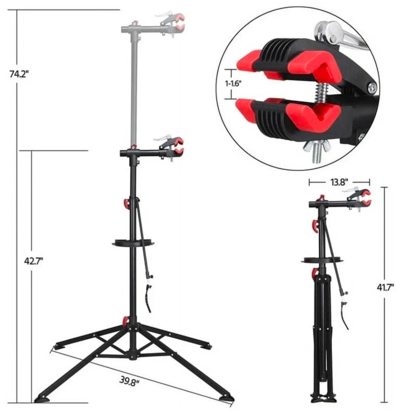 This professional bike repair stand is made from quality metal and durable plastic, with quick-release devices for holding your bike, adjusting the height and folding it up. This bike repair stand aims to offer you a great maintenance/repairing experience. The telescopic tubes, a small tool tray, and foldable legs optimize this simple work stand to provide you with a wonderful experience. With this repair workstation, you don't need to bend over and cause aches.