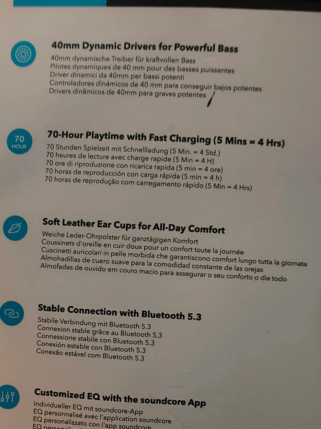 Enjoy 70 hours of playtime with these Soundcore H30i wireless headphones. They feature 40mm dynamic drivers for powerful bass and soft leather ear cups for all-day comfort. It's a foldable design with Bluetooth 5.3 connectivity.
