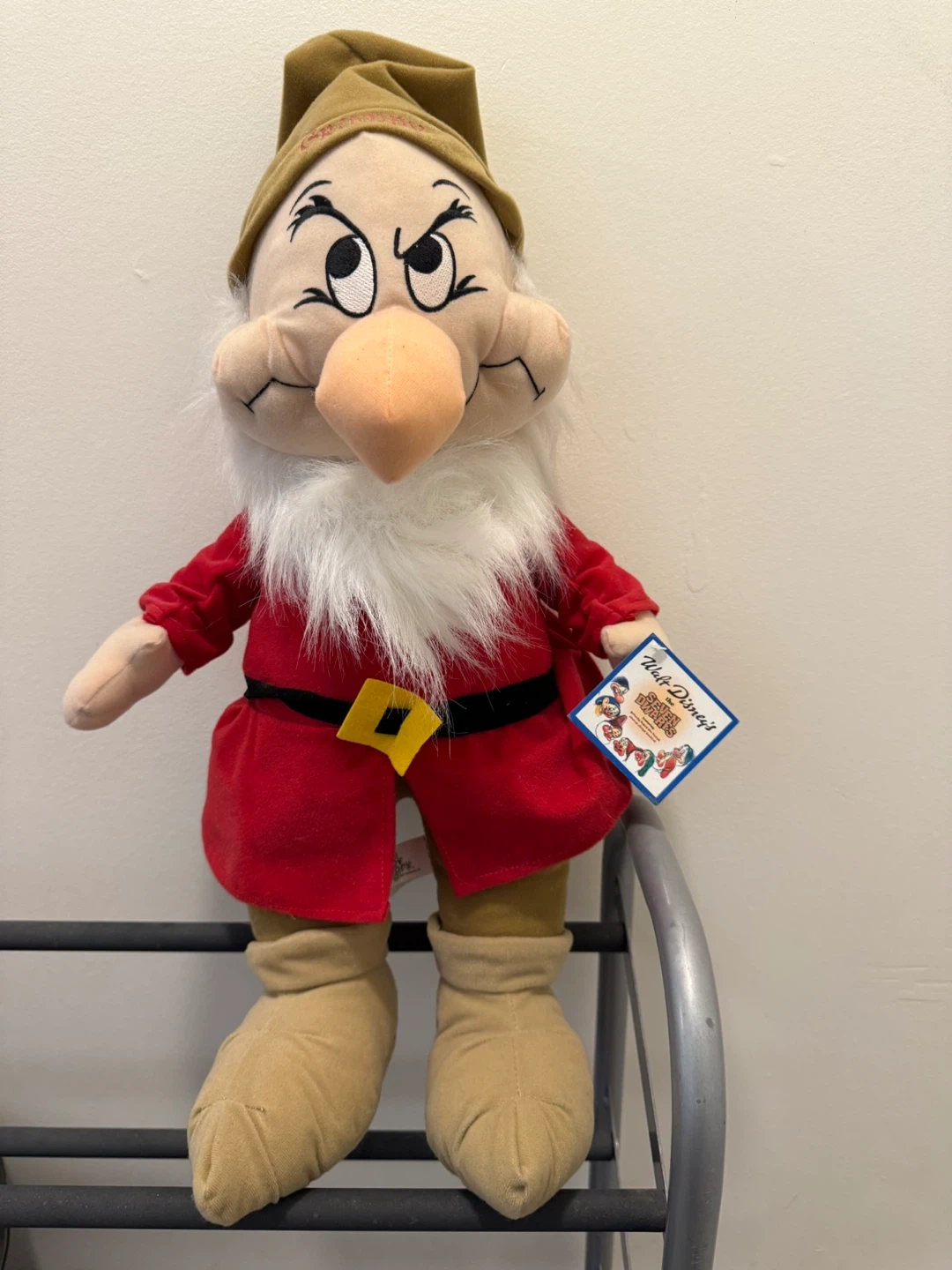 Walt Disney's Grumpy plush toy. Soft plush construction. Features his signature red tunic, brown hat, and grumpy expression. Perfect for any Snow White fan!