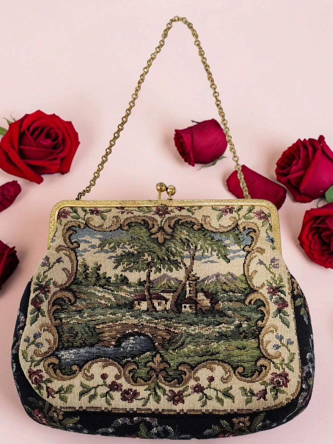 This vintage coin purse features a beautiful tapestry scene with a landscape, houses, and a bridge. It has a gold-tone chain strap and a decorative clasp with rhinestones. The sides are black with a floral embroidered pattern.