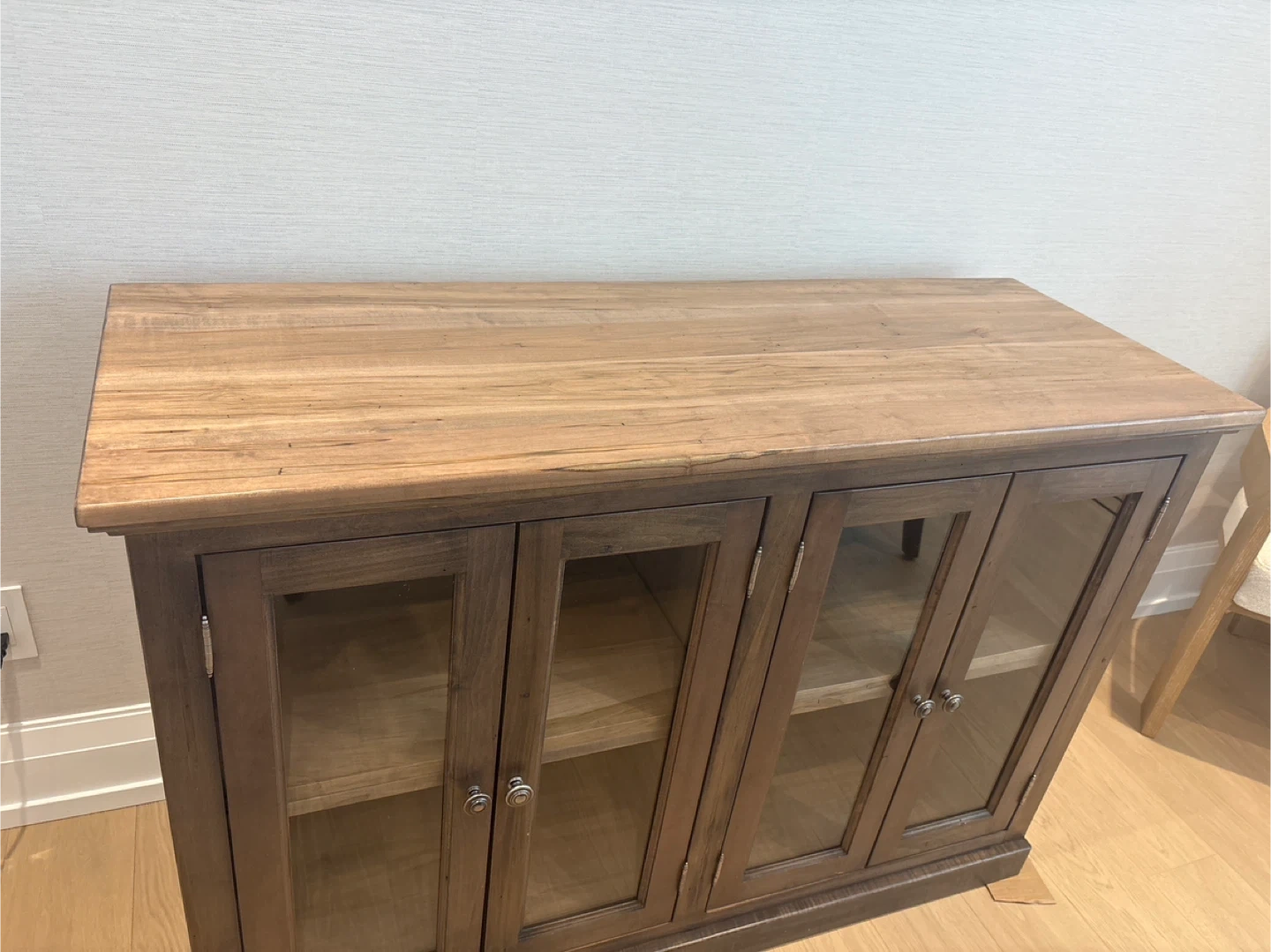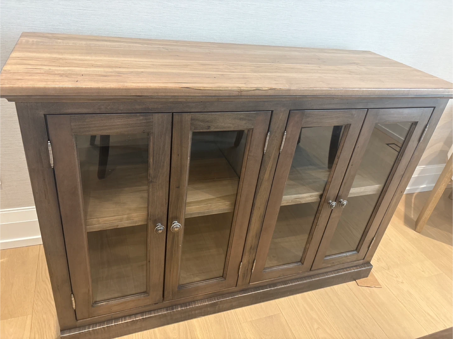 Solid wood TV console with four glass doors and internal shelving.