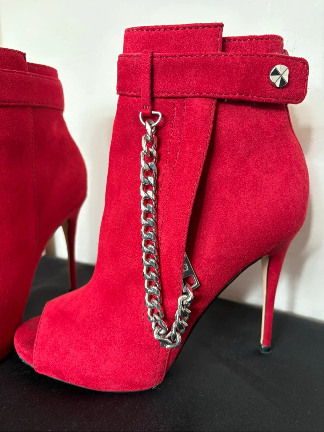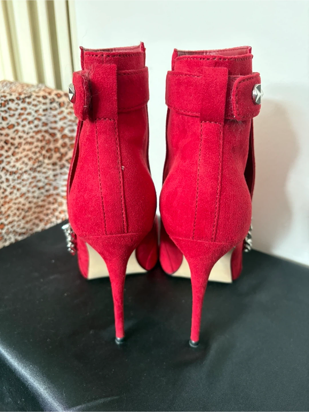 These bright red peep-toe ankle boots are sure to make a statement! They feature a stylish chain detail and a comfortable heel height. Perfect for adding a pop of colour to any outfit