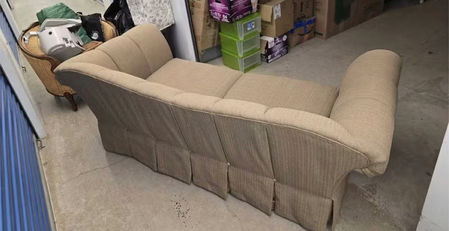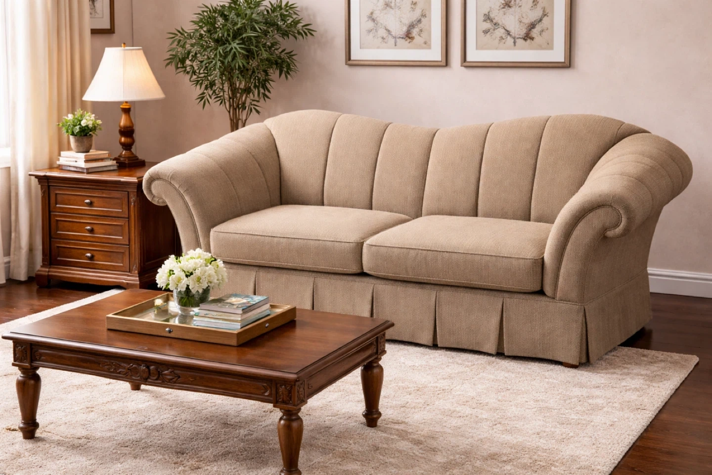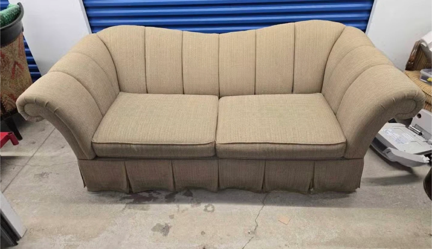 This is a Signature HOME Collection loveseat sofa. It's upholstered in a textured beige fabric with a pleated skirt. The sofa has a supportive seat and a distinctive rolled armrest design.