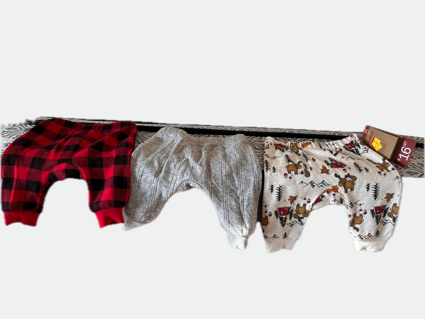 Here's a set of three adorable baby pants! One is a red and black buffalo check, another is a grey ribbed knit, and the third is a white print with moose and trees.