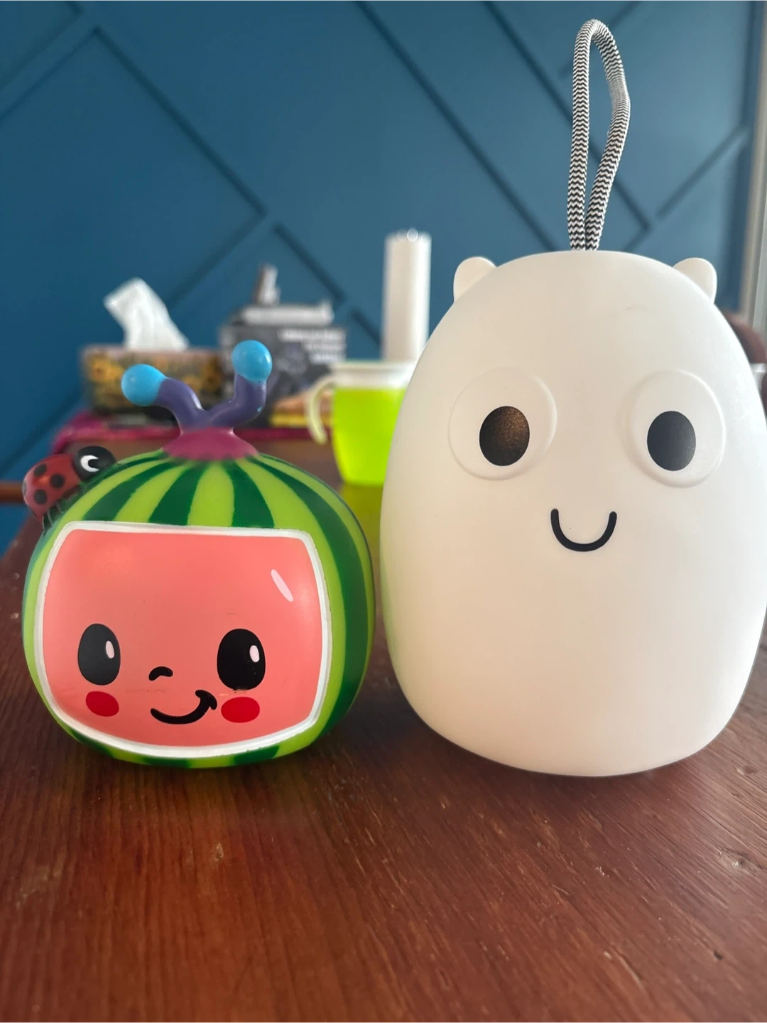 This set includes a Cocomelon watermelon lamp and a white bear-shaped night light. The night light has a convenient loop for hanging. Perfect for little ones who love Cocomelon, no batteries included