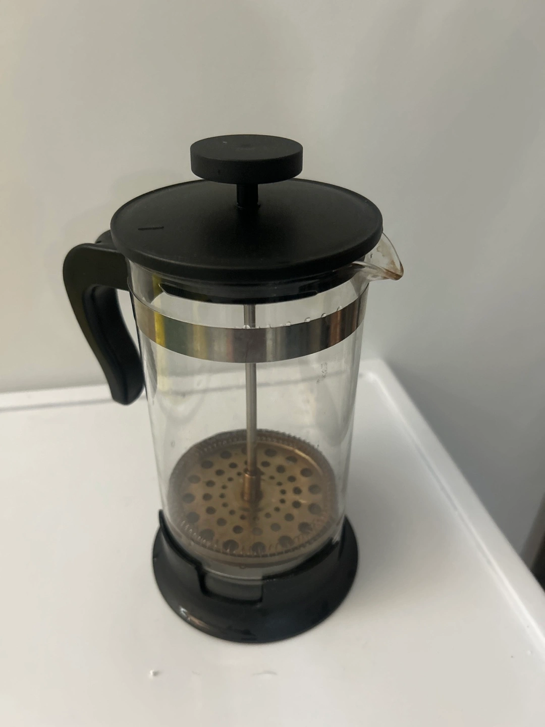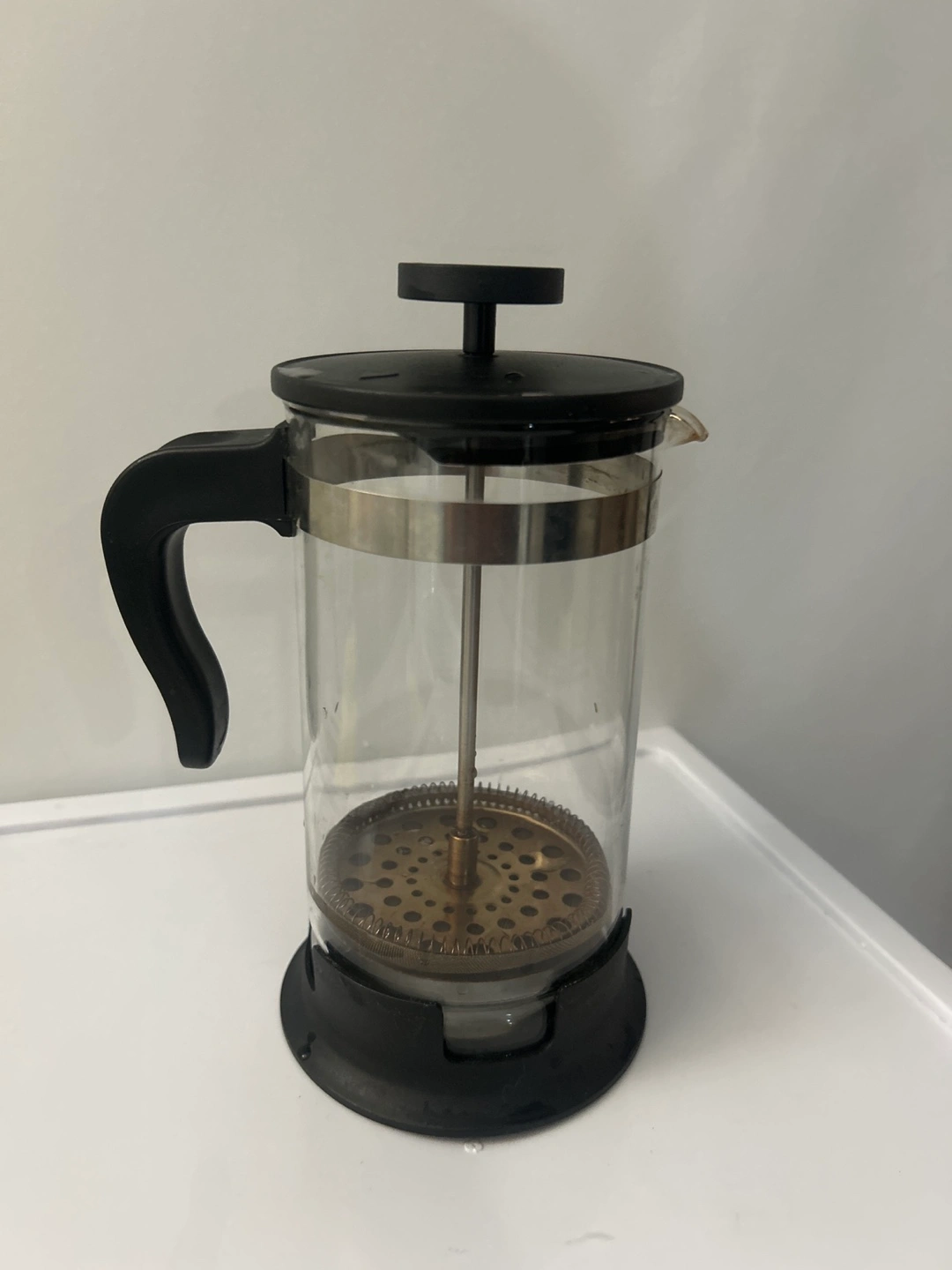 Glass French Press coffee maker with black plastic handle and lid. Includes metal filter and plunger. Suitable for brewing coffee or tea.