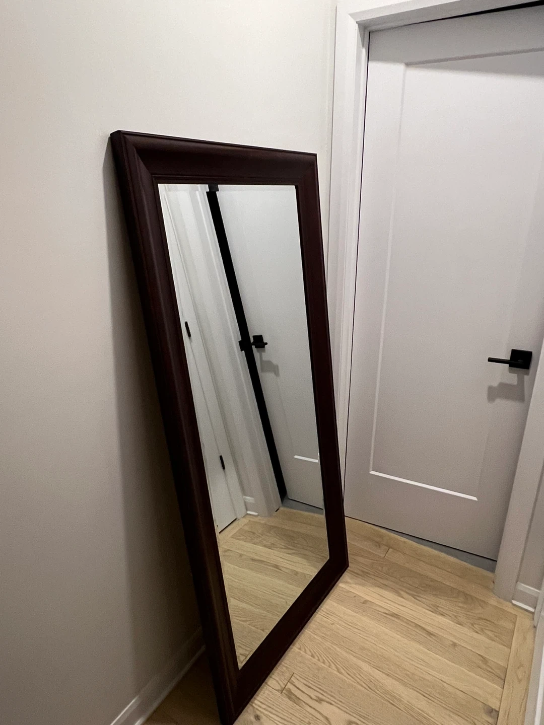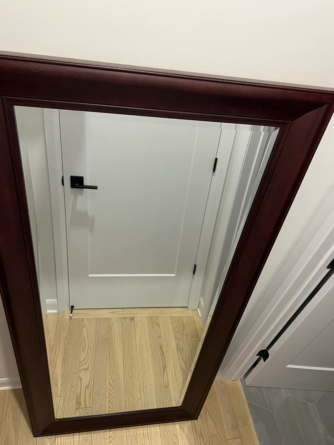 A lovely full-length mirror with a dark wood frame. It's perfect for checking your outfit before heading out. The reflective surface is clear and bright. Can be hung vertically or horizontal.