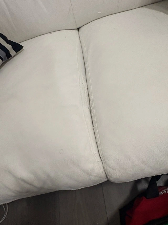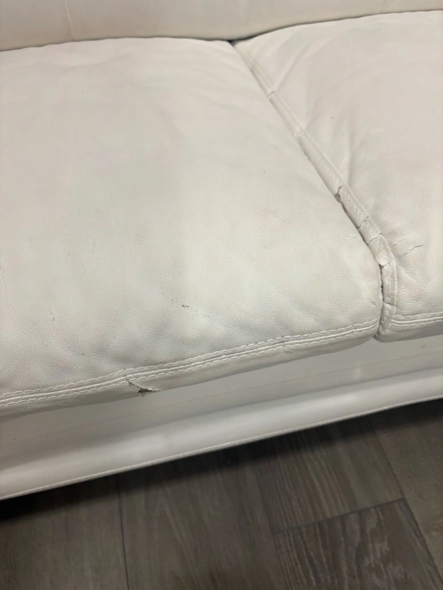 This is a stylish, modern white leather couch, perfect for adding a touch of elegance to any living space. It's a comfortable seating option. Note that this couch is in used condition and has some visible wear and tear, including some cracking, as shown in the pictures. White couches 76 by 34 inches and 56 by 34 inches. Condition: Used - Good. For Sale By: Owner. Cash accepted.