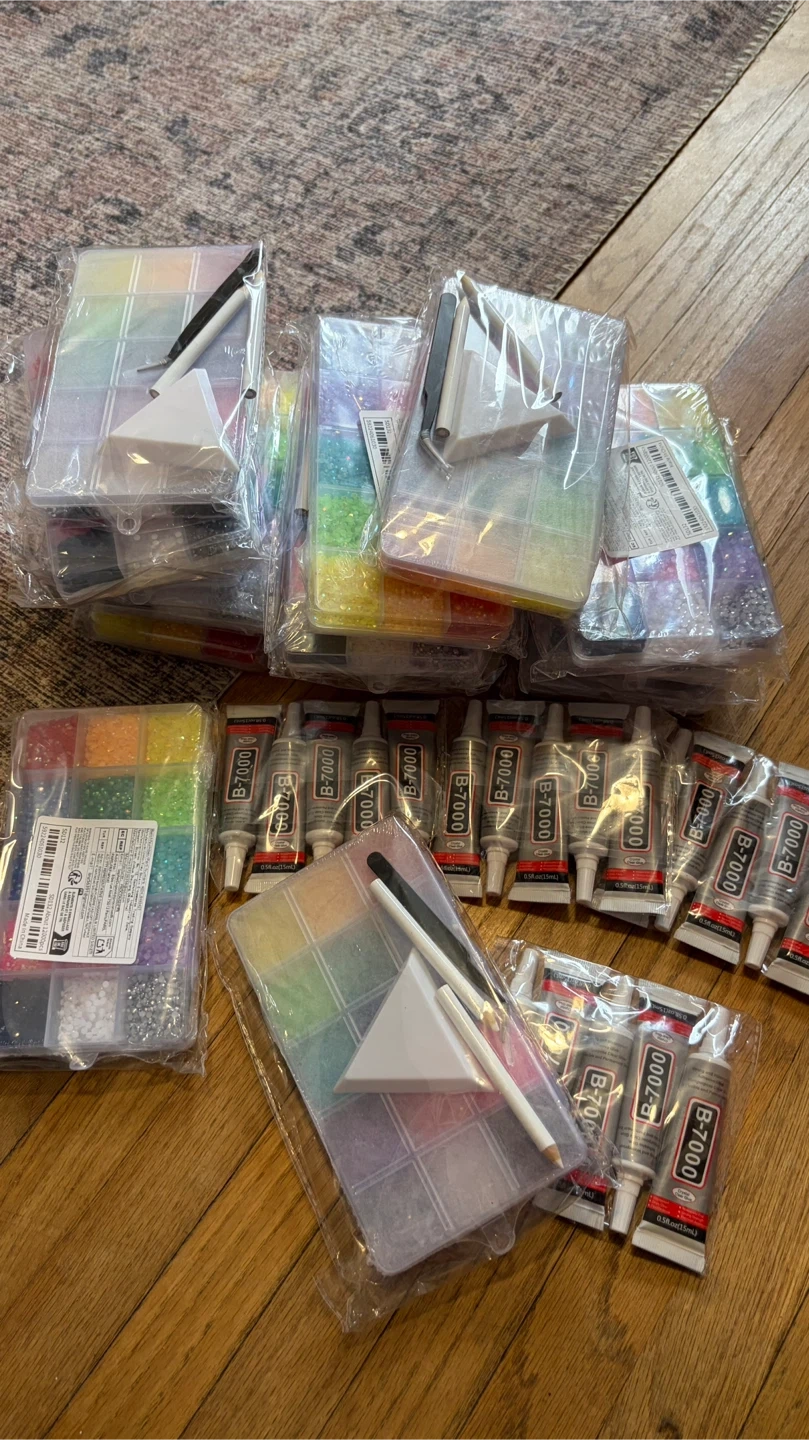 Brand New 15 plastic rhinestone kits with triangle tray, 2 wax pencils and tweezer sets.