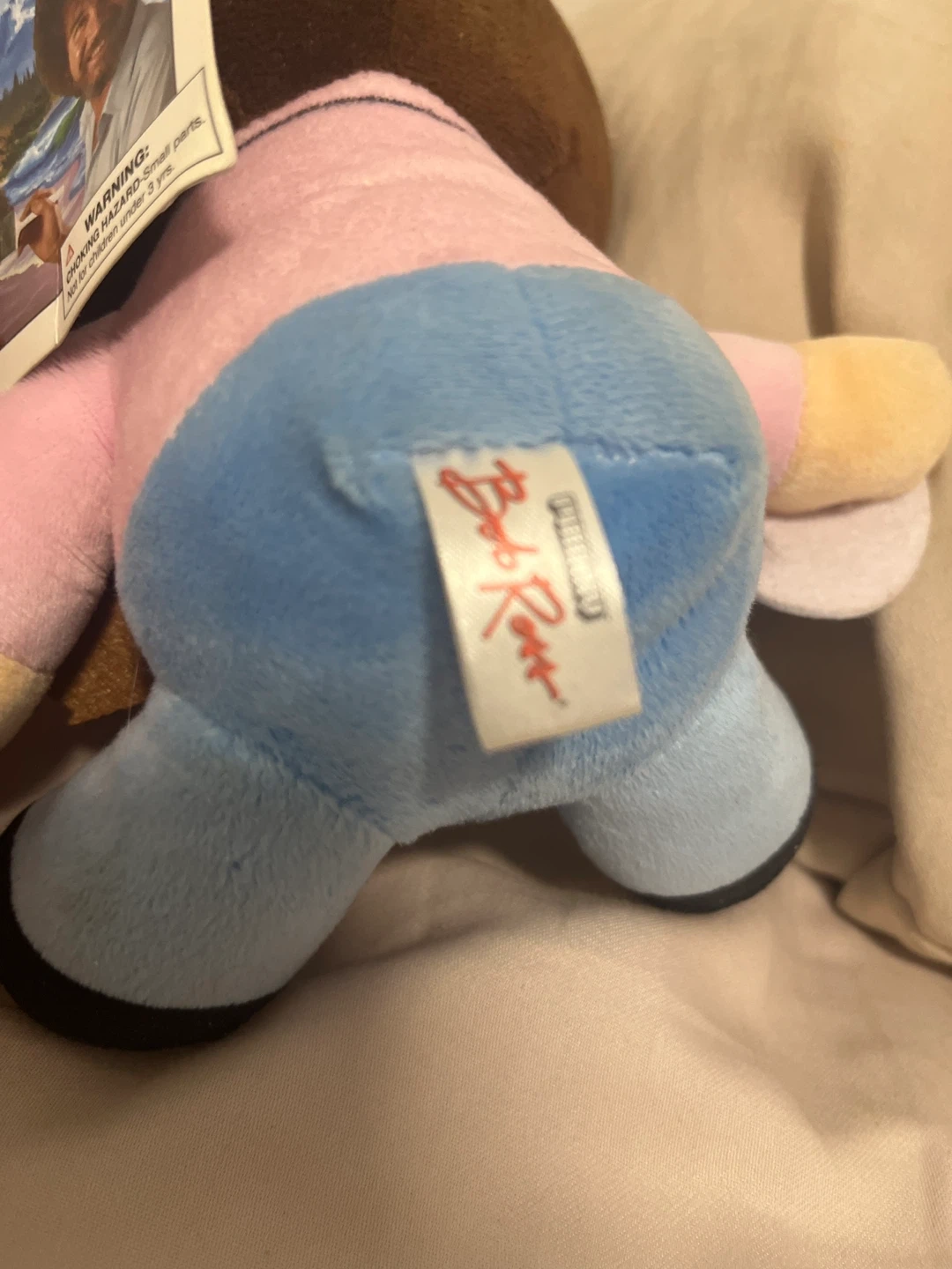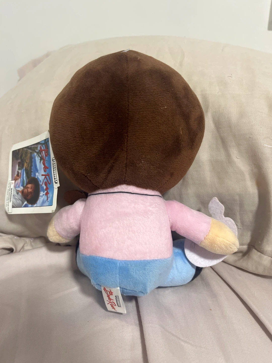 This is a plush toy featuring Bob Ross, complete with his iconic hairstyle, beard, and pink shirt. It also includes a small plush squirrel accessory. The plush is made of soft fabric.