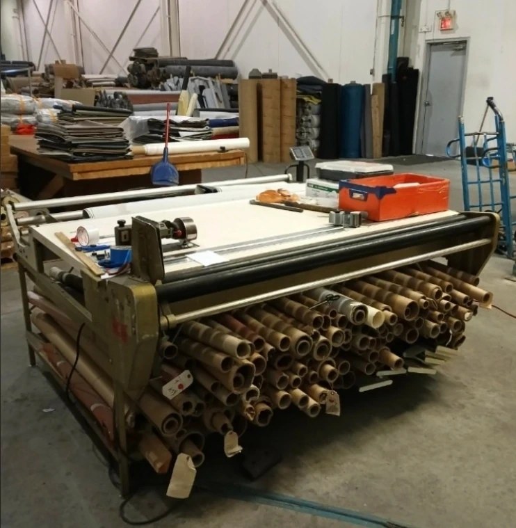 This industrial fabric cutting table comes with a built-in rack for storing numerous rolls of material. It's perfect for textile shops or upholstery businesses. It includes a measuring tape guide and a cutting blade assembly.