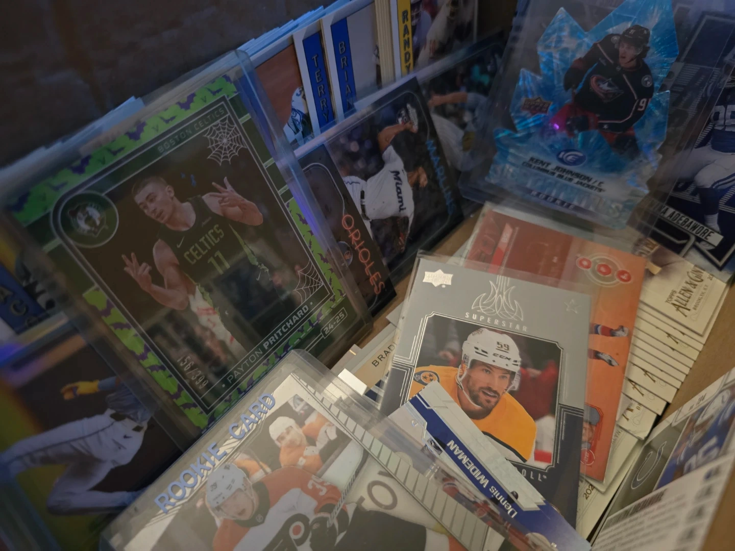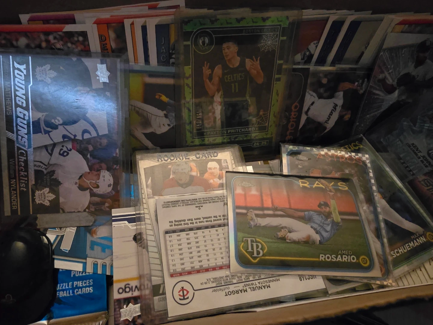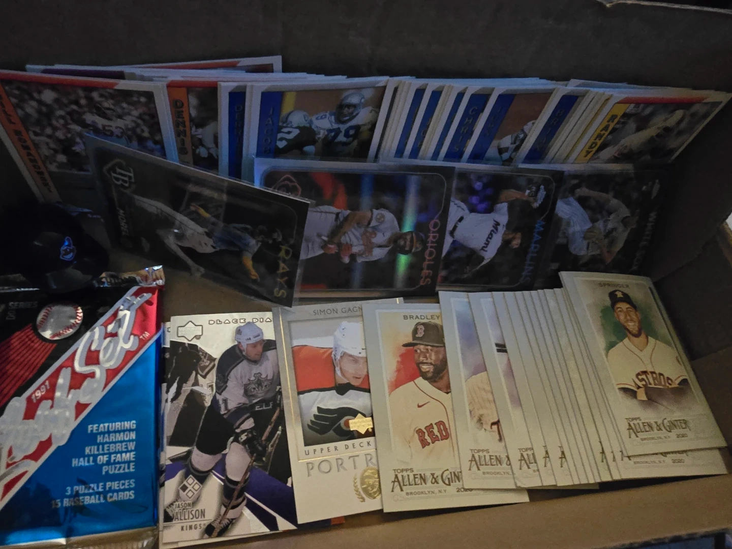This is a box full of various sports trading cards, including hockey, baseball, and basketball. Many are from brands like Upper Deck, Topps, and Allen & Ginter. Some cards are in protective sleeves, and there's a pack of 1991 Upper Deck. It's a great collection for any sports memorabilia enthusiast!