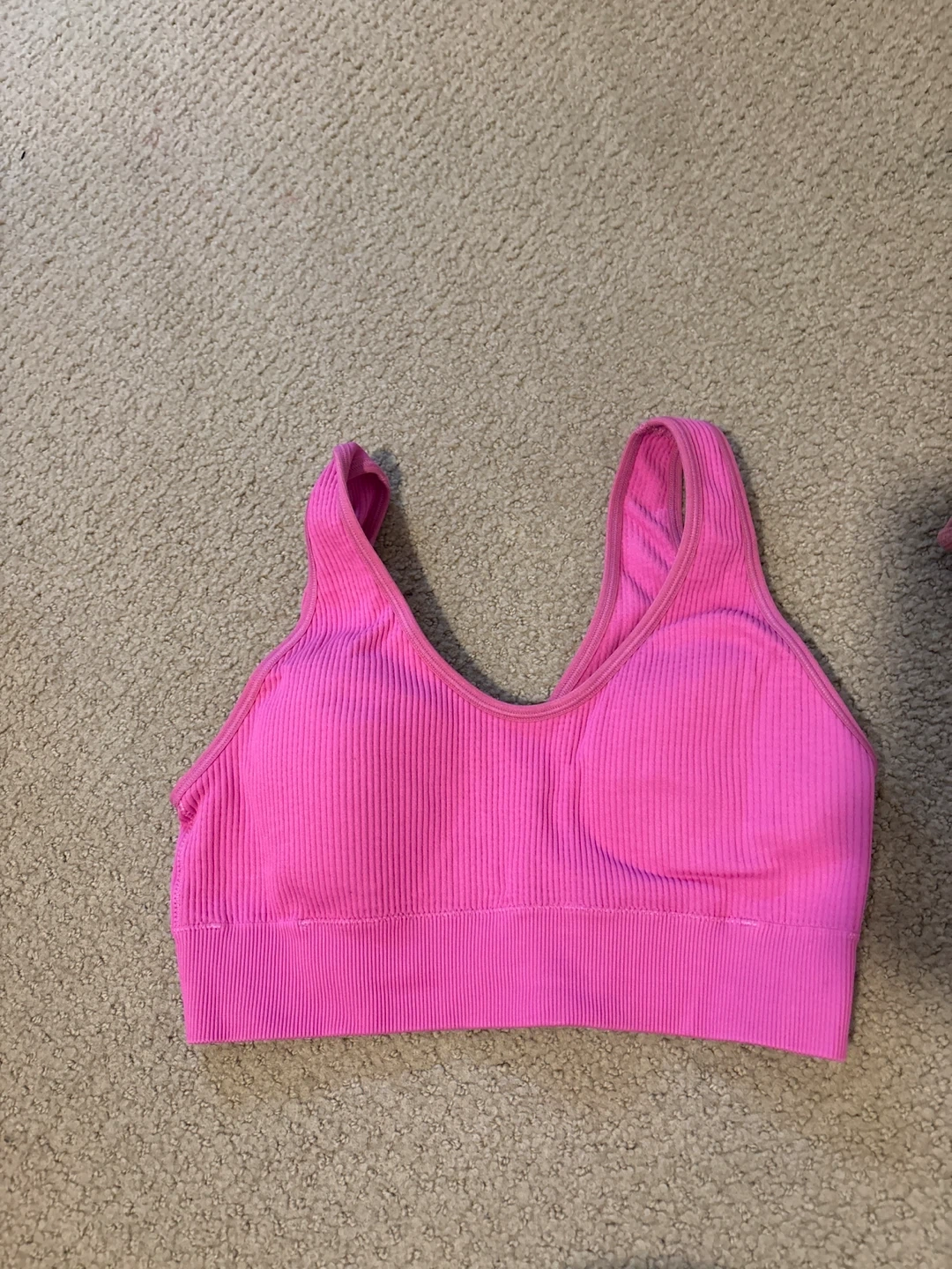 This pink sports bra is made with a comfortable ribbed material. It features a v-neckline and a supportive band. This bra is great for everyday wear or light workouts.