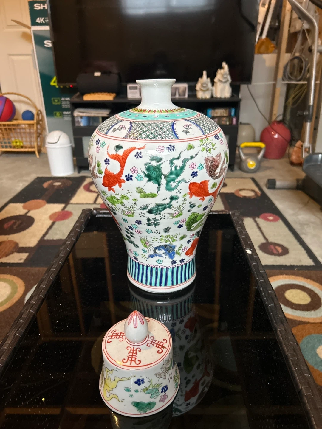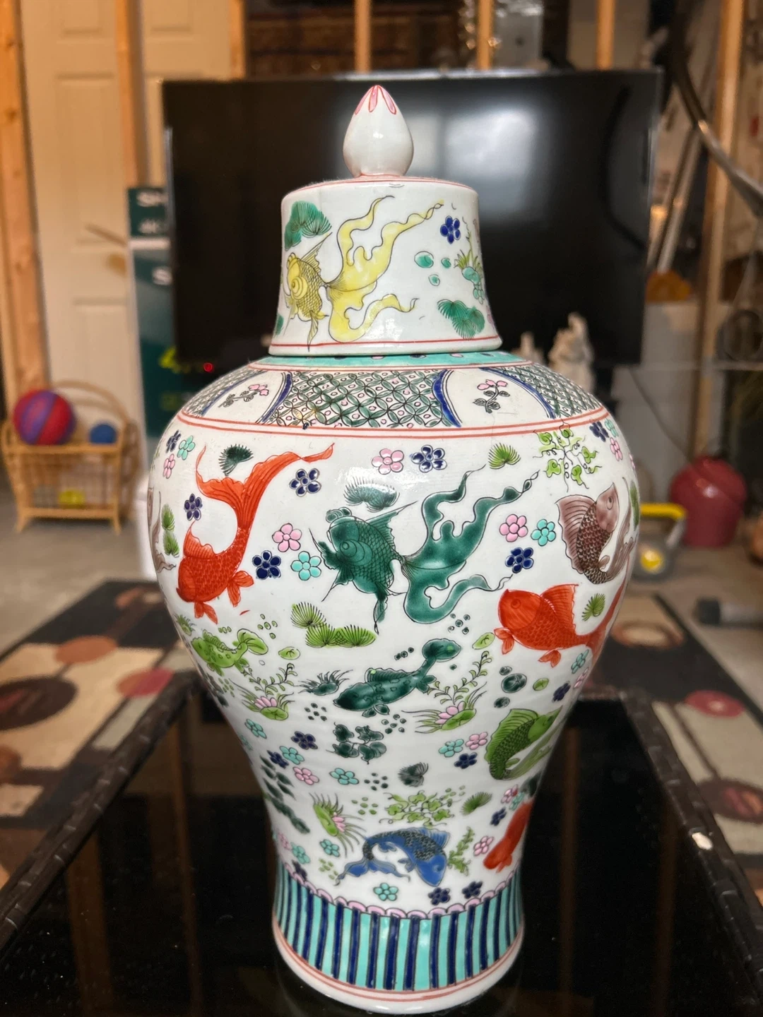 Selling a unique vintage vase adorned with fish and floral designs. It's a beautiful piece that would add a touch of elegance to any room. Perfect for collectors or anyone looking to enhance their home decor