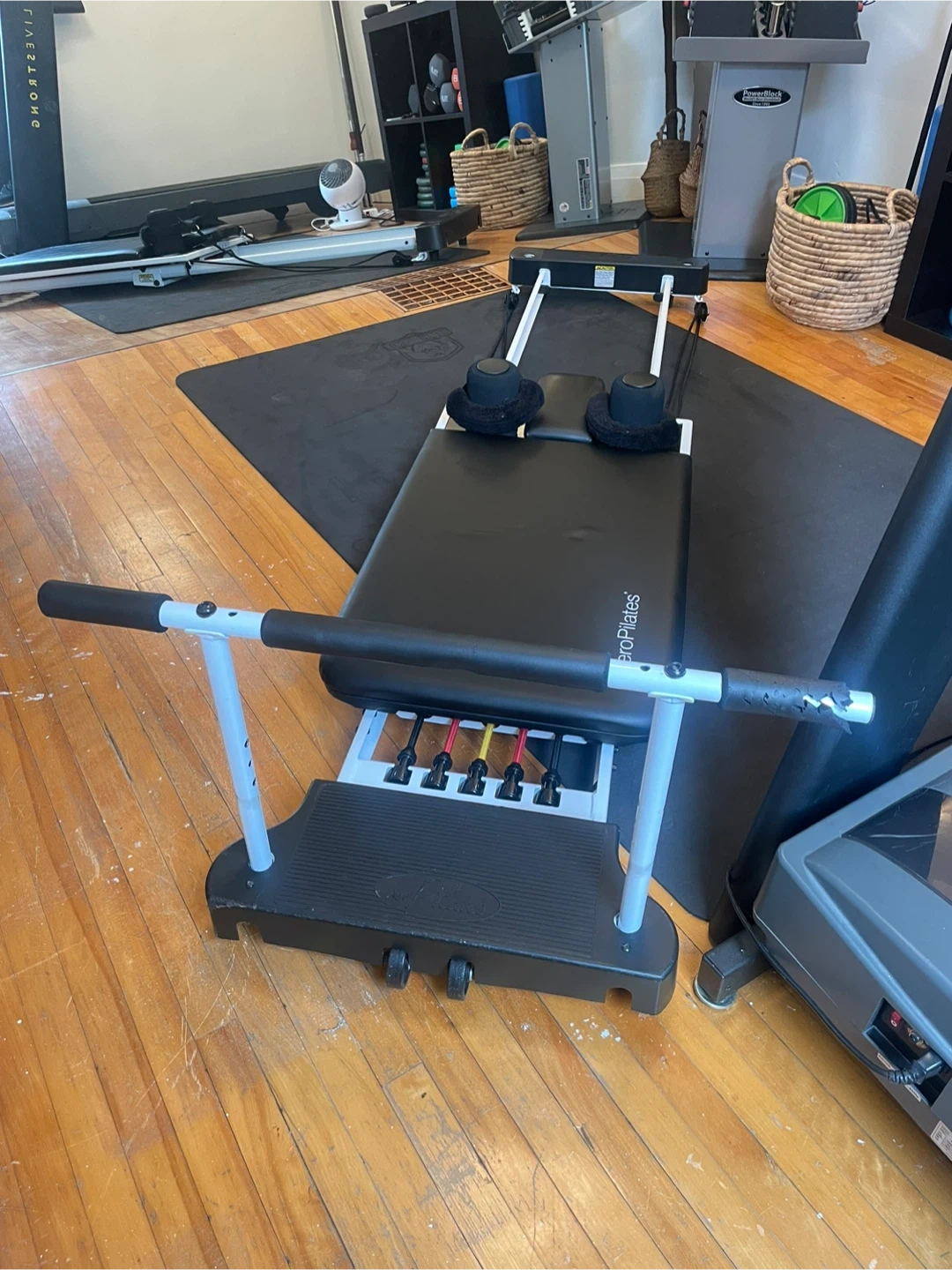 This AeroPilates reformer is designed for home workouts. It comes with a set of resistance cords in various colours. Some wear is visible on the foot bar grips.