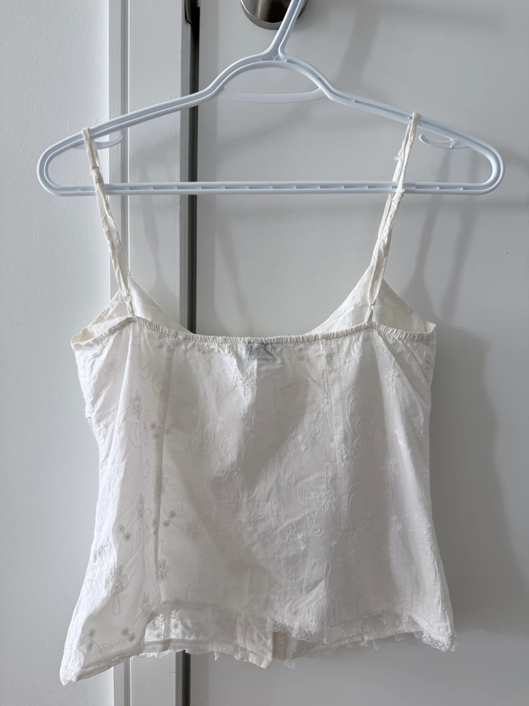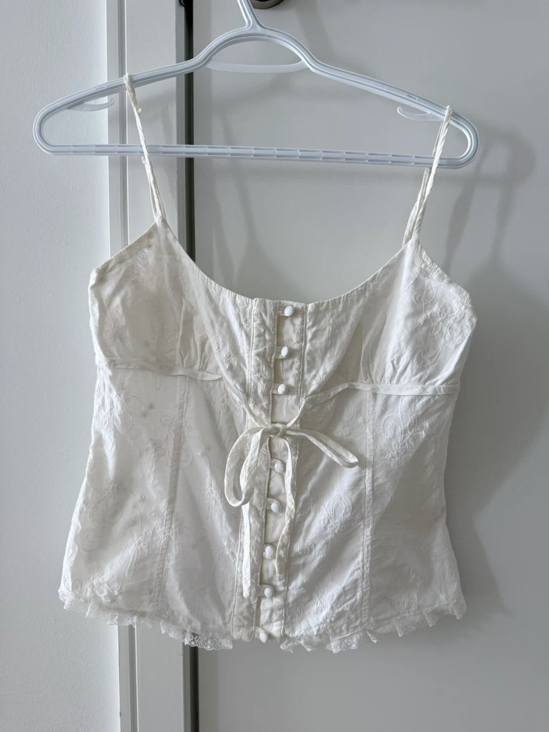 A lovely white cami top with intricate embroidery and delicate lace trim. It features a button-up front with a tie detail at the waist.