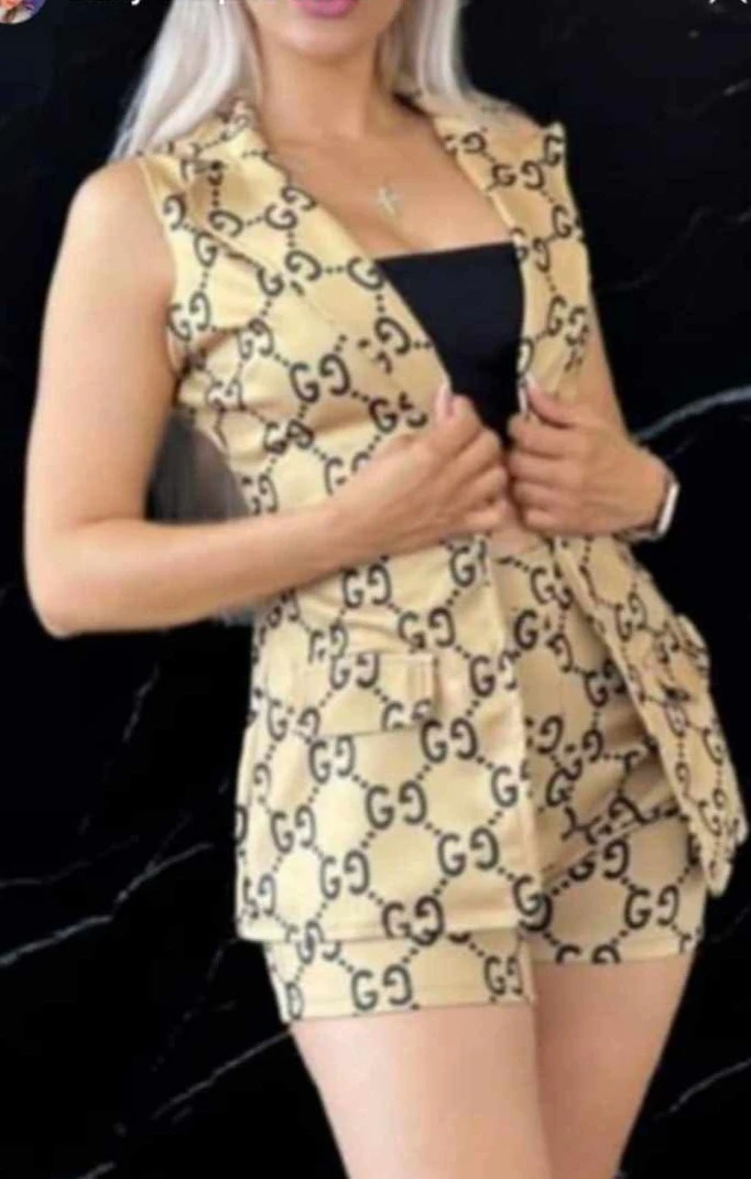 Selling a cute two-piece set with a Gucci-inspired pattern! The set includes a vest and shorts. Nuevo azul marino