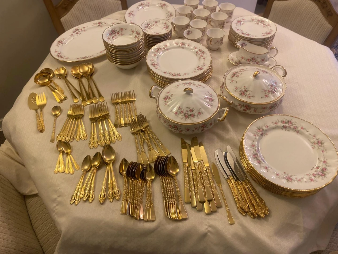 Beautiful Royal Albert bone china dinnerware set in the Victoriana Rose pattern. This extensive set features a delicate floral design with gold trim and includes numerous plates, bowls, cups, saucers, serving dishes, and a full set of gold-plated cutlery. Perfect for formal dining or special occasions!