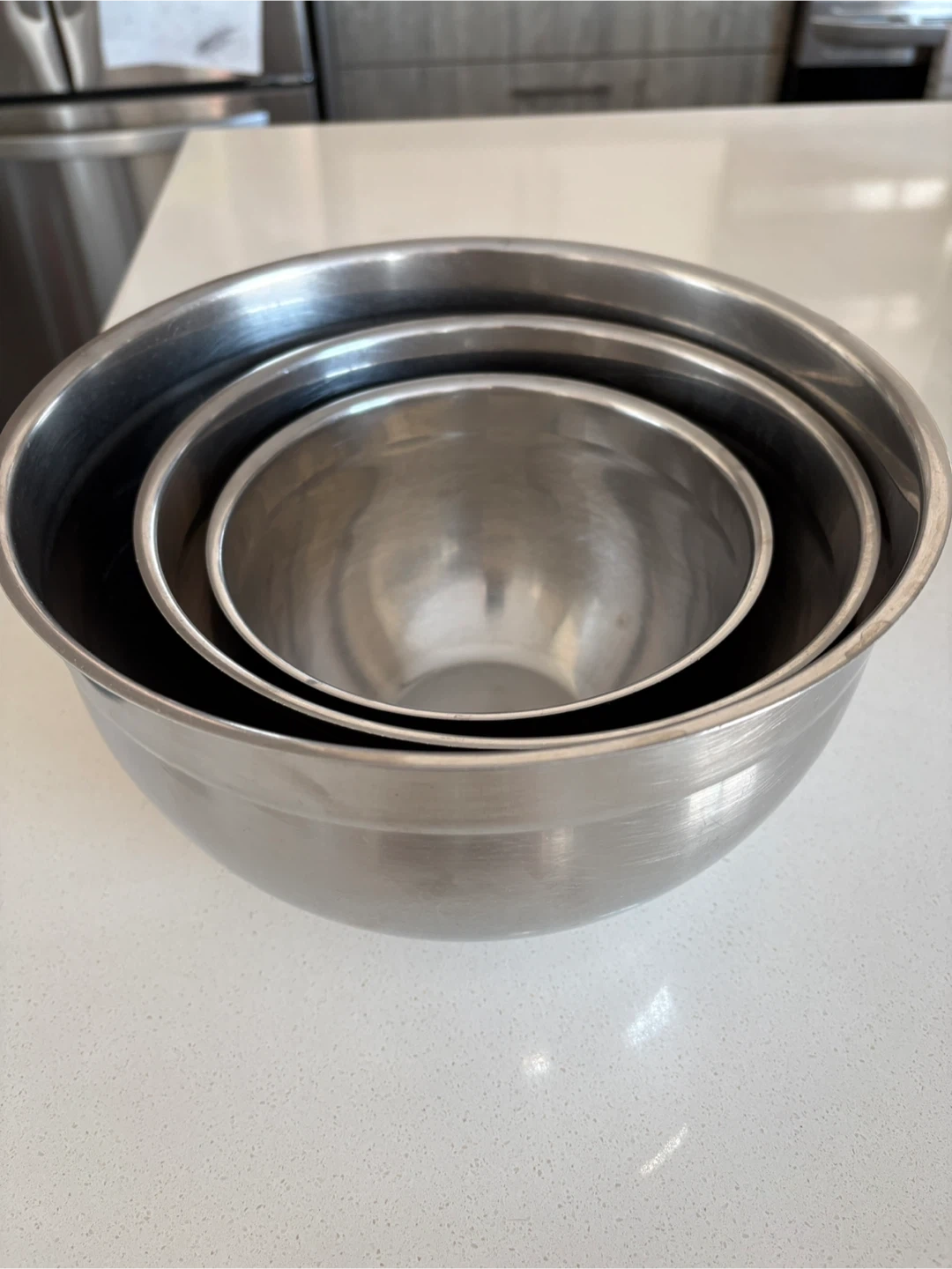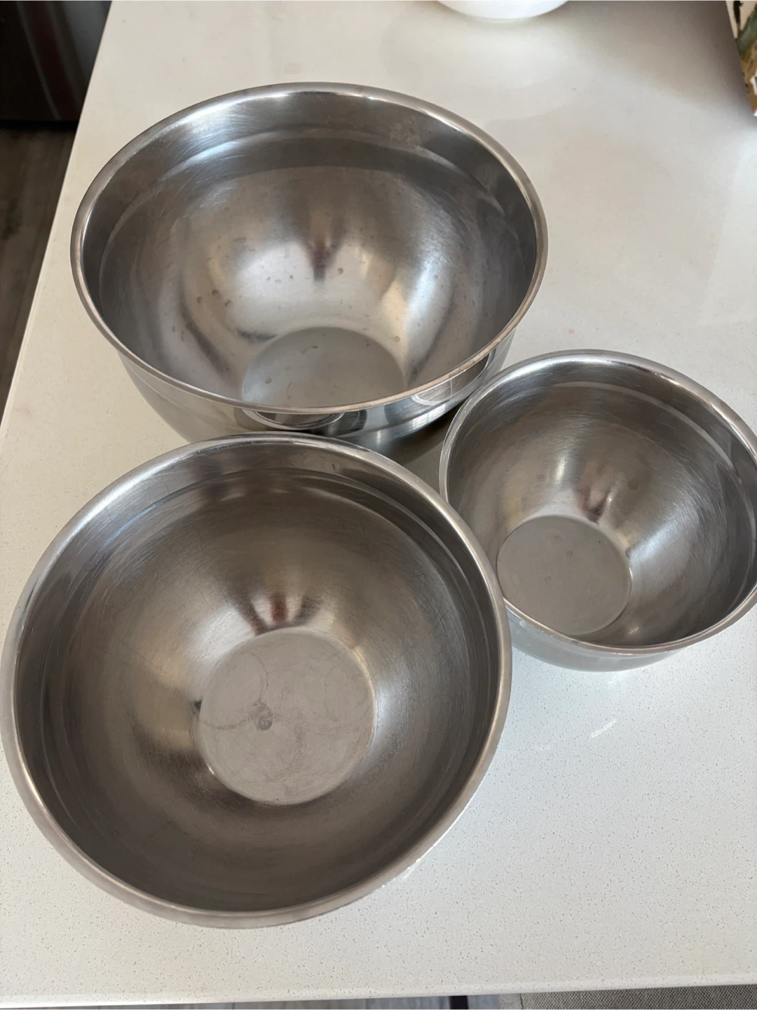 This is a set of three stainless steel mixing bowls. They're made of durable stainless steel and nest together for easy storage. Heavier steel, not the light ones