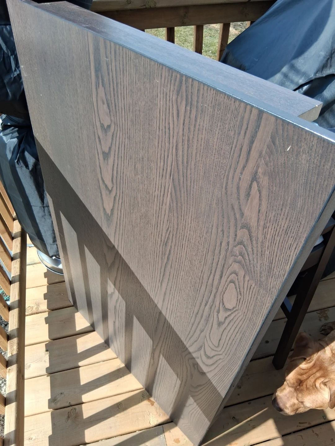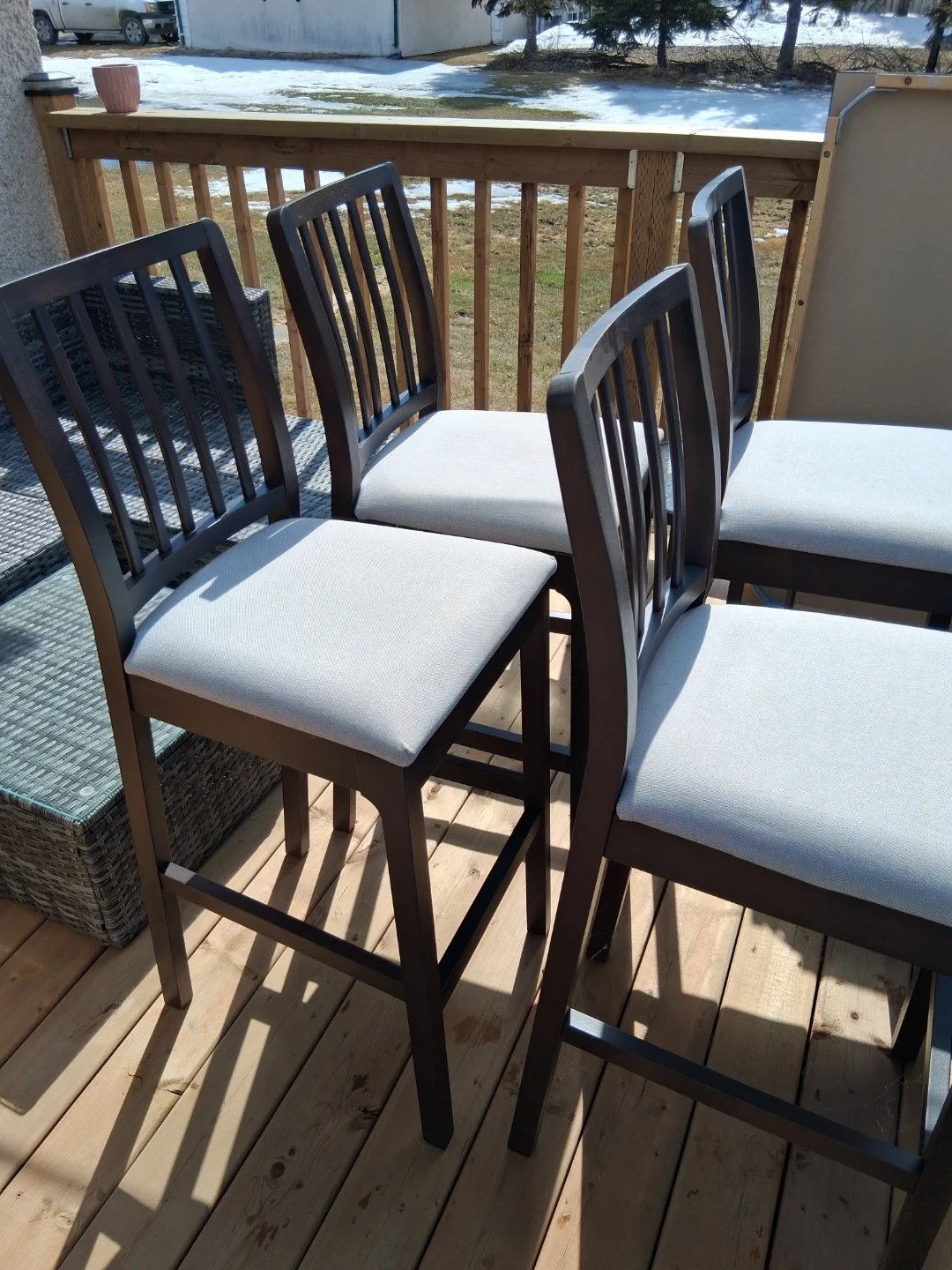 This is a set of four counter height bar stools and kitchen table. They have dark brown wooden frames and light grey upholstered seats. The backrests have a slatted design. Height is 41.5"