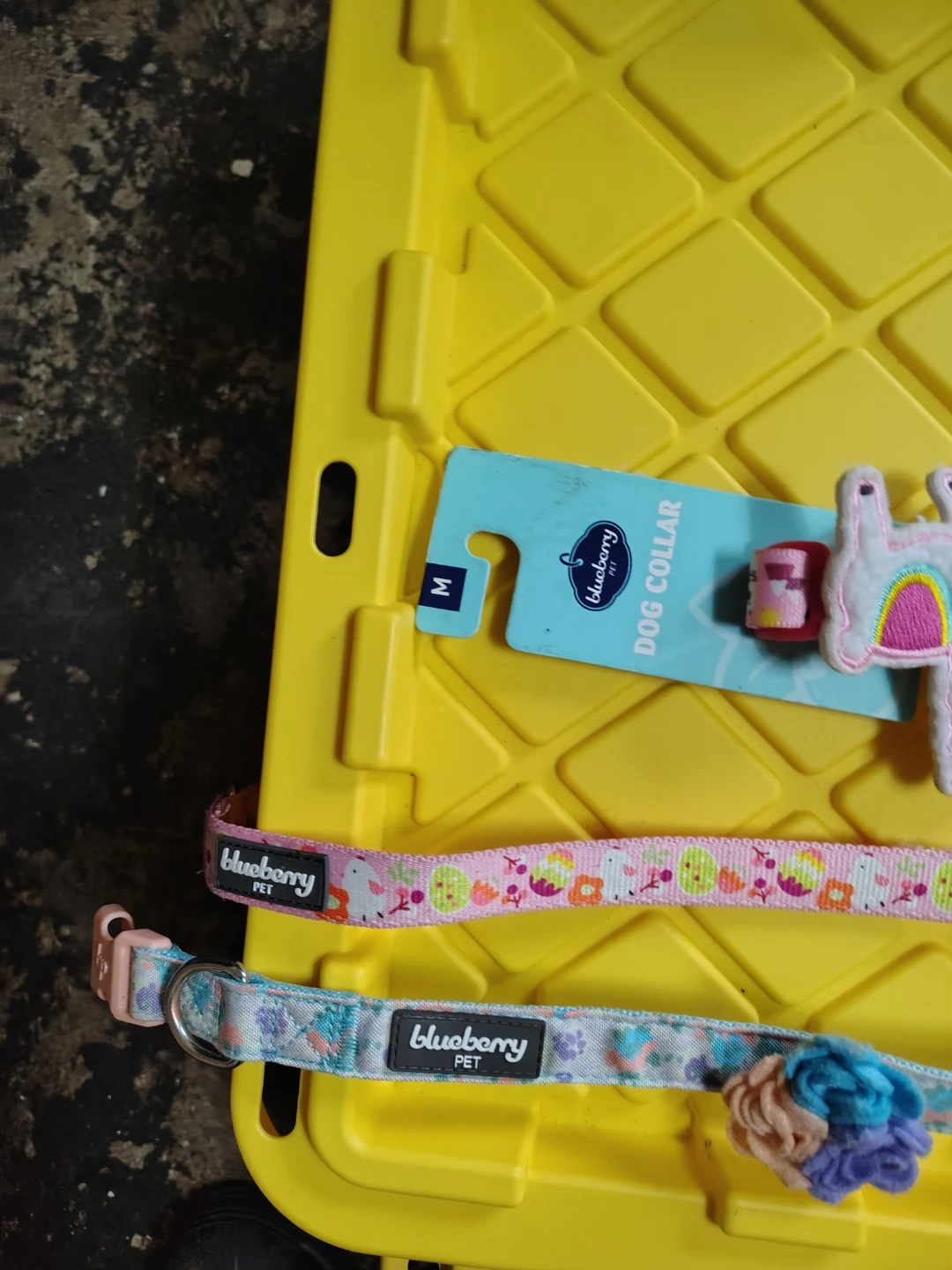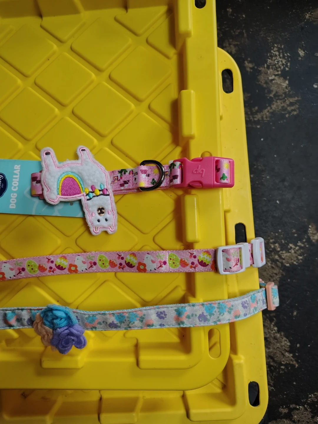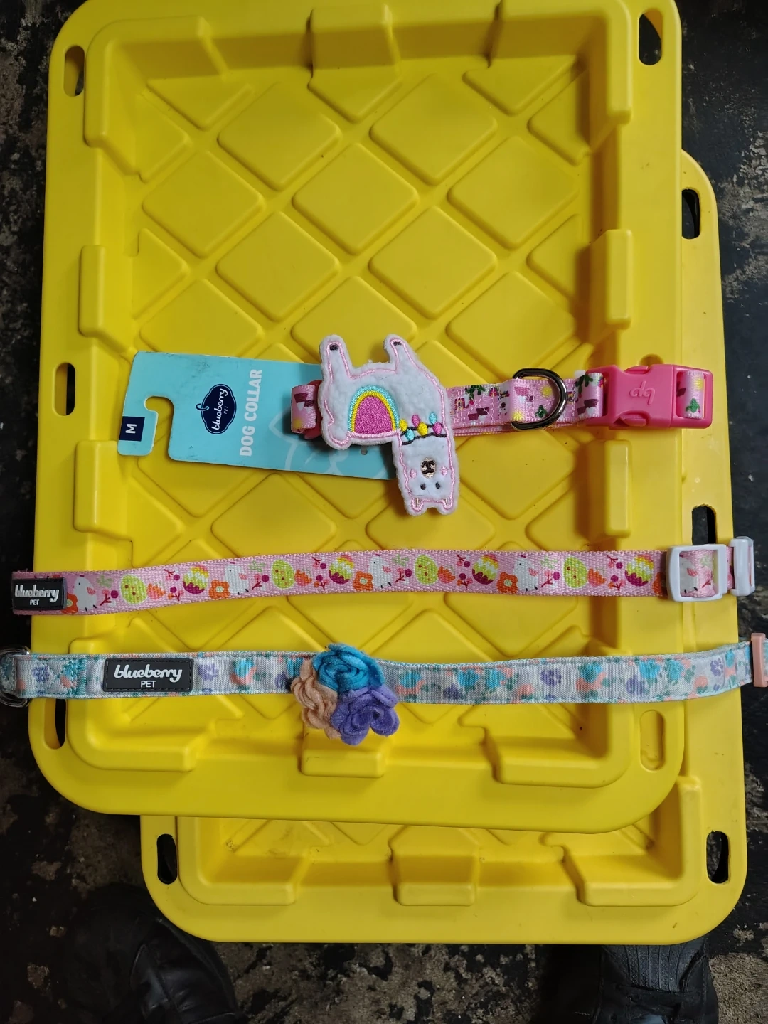 Set of three Blueberry Pet dog collars. Includes one size M collar with a llama design and a pink buckle, one collar with a pink and fruit pattern, and one collar with a floral pattern and a flower embellishment. These collars are adjustable and feature colorful designs.