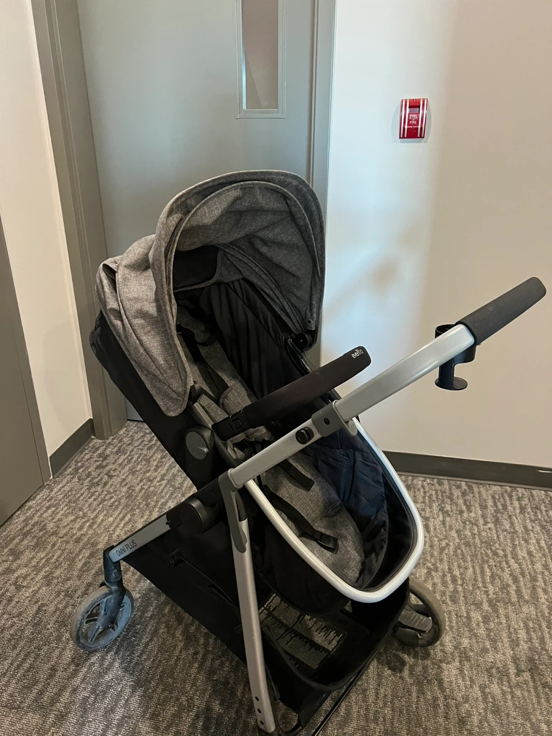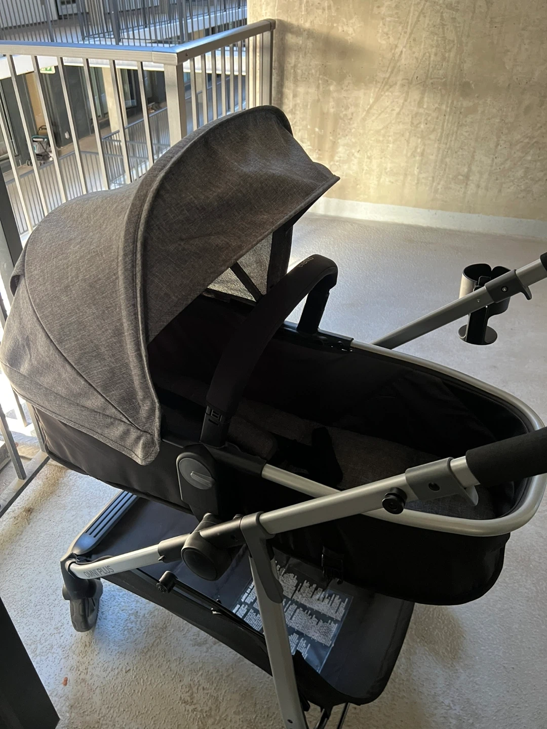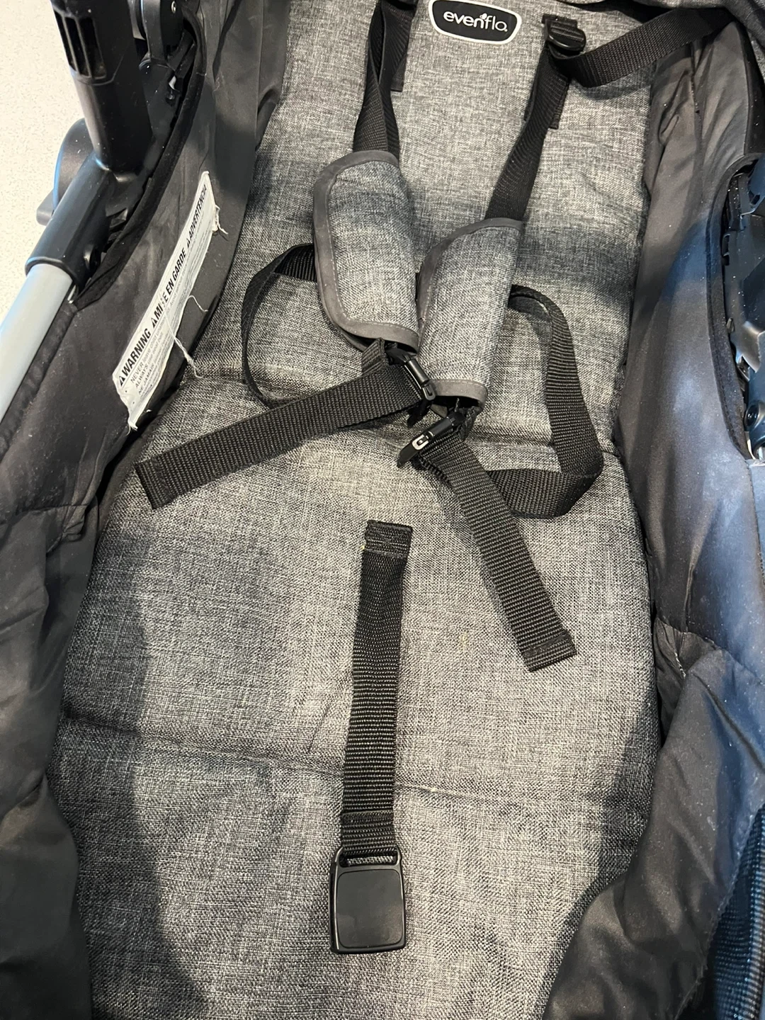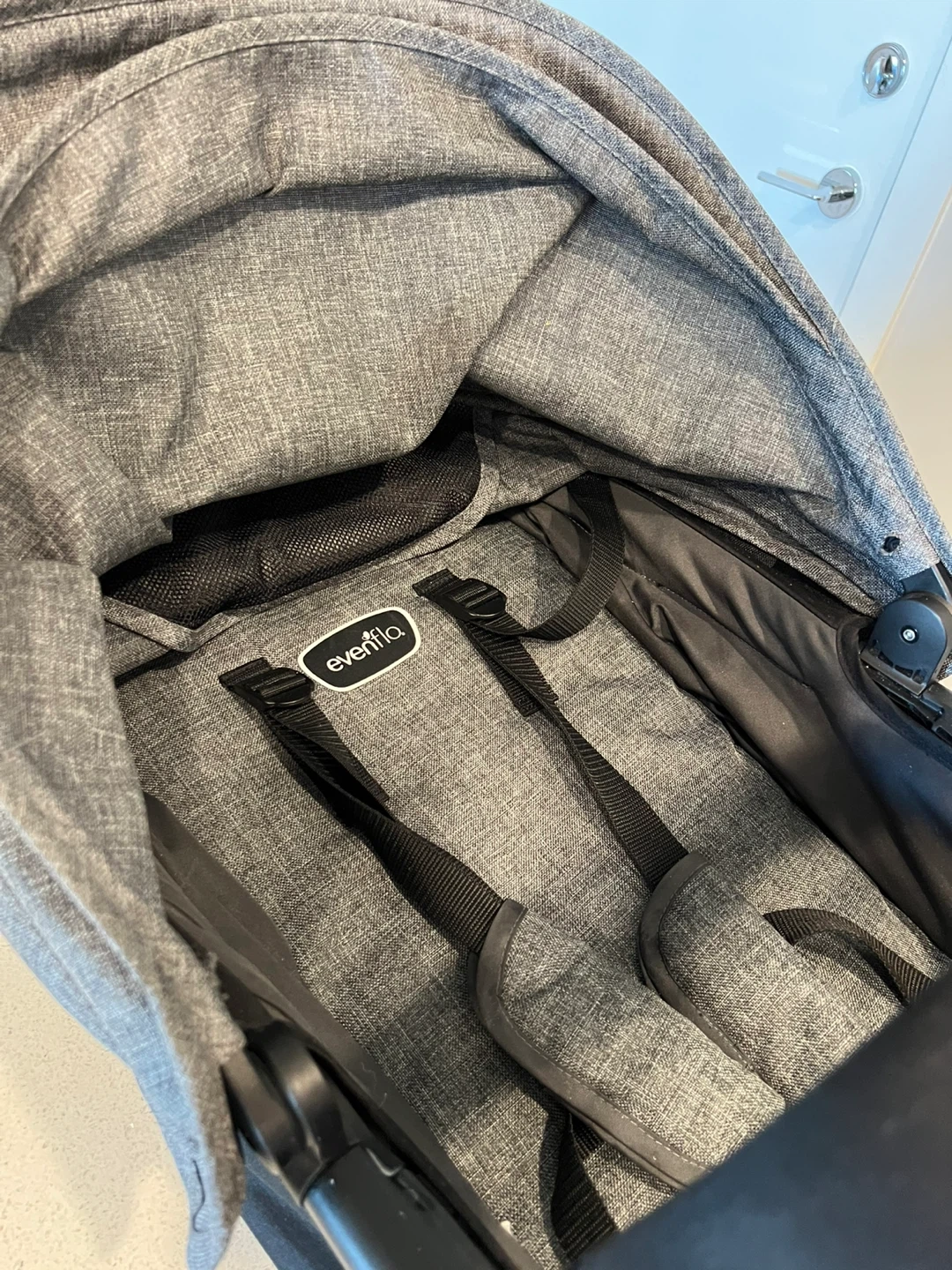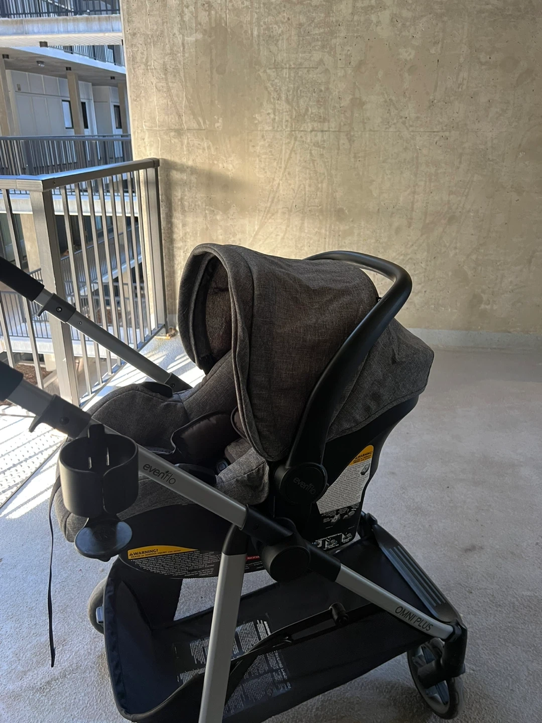 This Evenflo Omni Plus travel system includes a stroller and a LiteMax infant car seat. It's designed for convenience with a car seat that clicks into the stroller. It's a great setup for getting around with a baby!