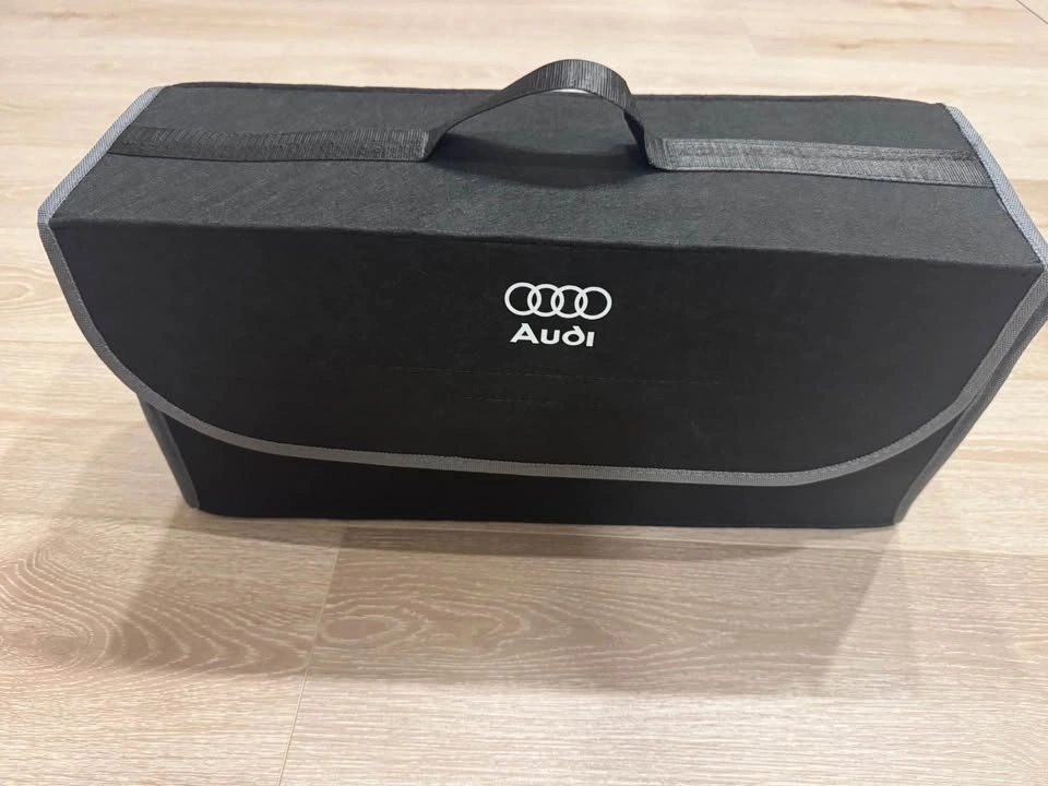 Brand new trunk storage tote, still sealed in plastic. This clean black organizer with Audi branding is perfect for keeping your trunk neat and organized with a clean OEM look. Great for groceries, tools, detailing supplies, emergency kits, or everyday car essentials. Features: Audi-branded design, large storage capacity, durable structured construction, Velcro on bottom and back to prevent sliding, and it folds flat when not in use. Keeps items secure and prevents them from rolling around while driving. Price: $40. Pickup: Seton.