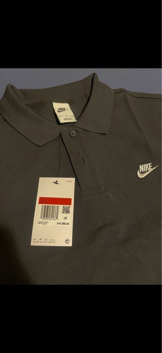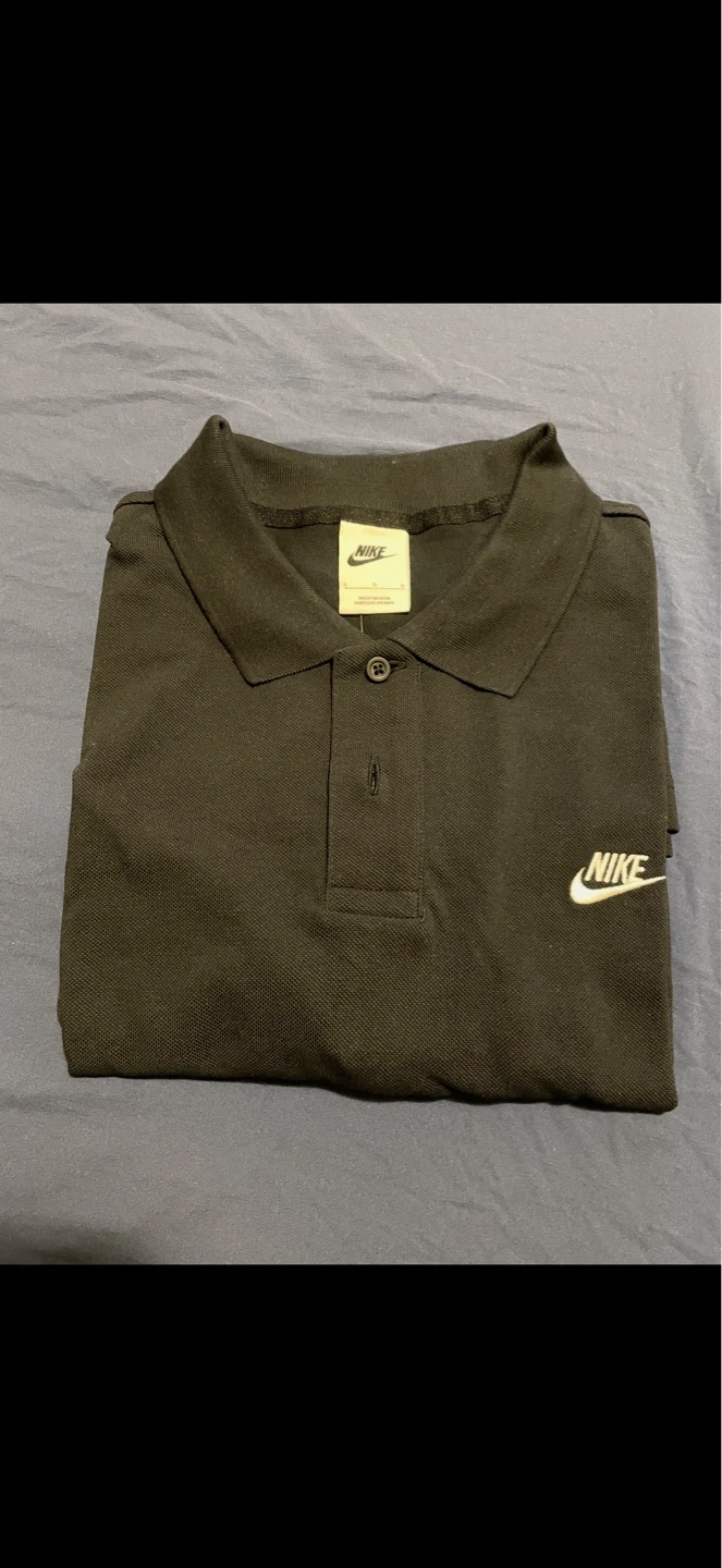 This is a Nike men's polo shirt in black. It features the iconic Nike logo embroidered on the chest. The shirt is made of comfortable, breathable fabric. It's perfect for casual wear or light athletic activities. This is a size LARGE mens.