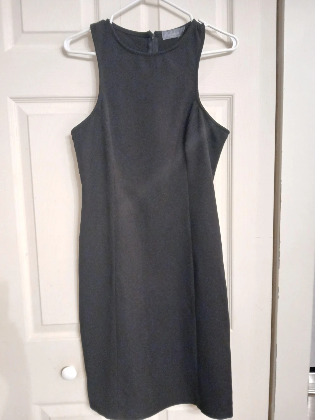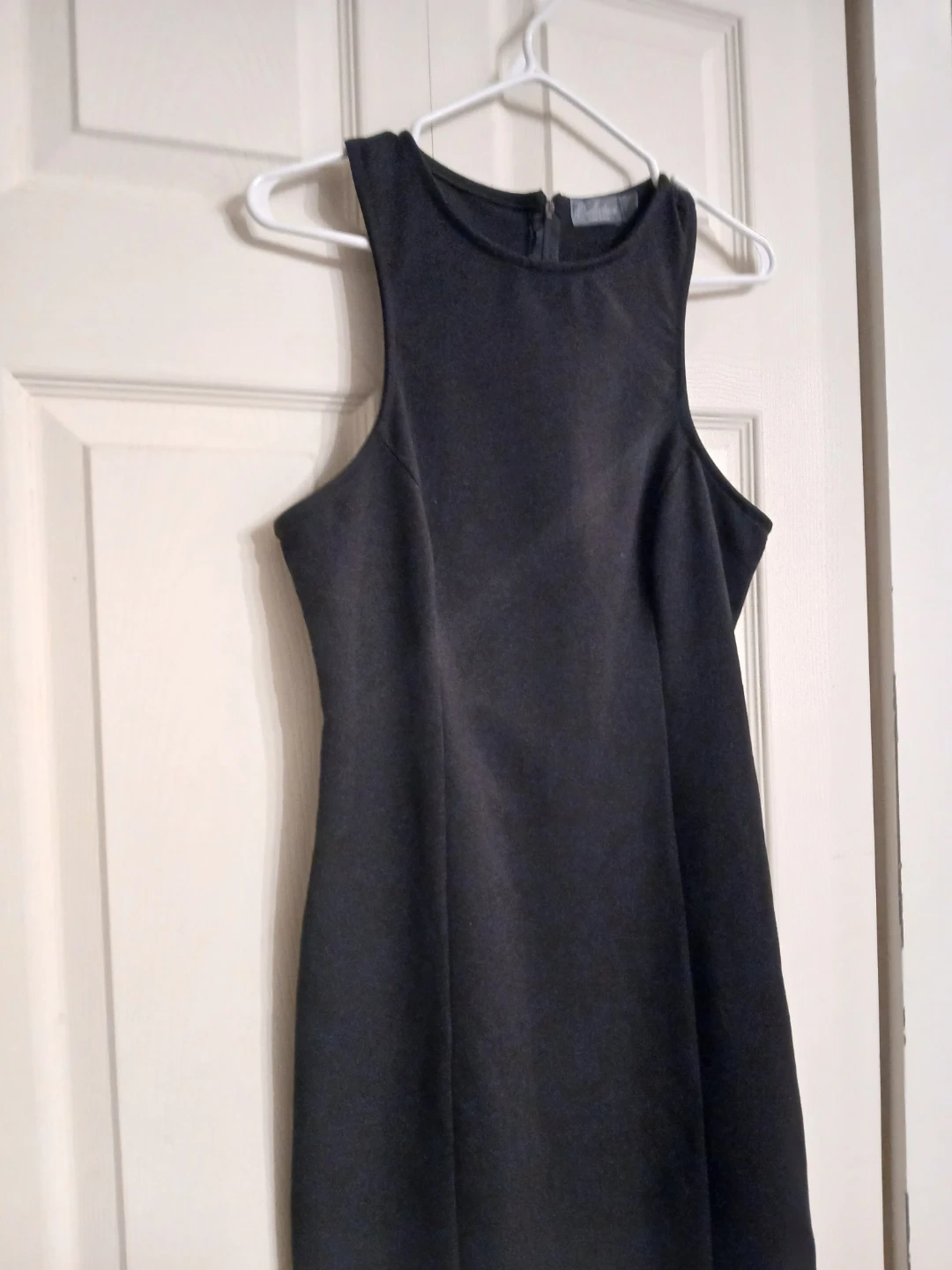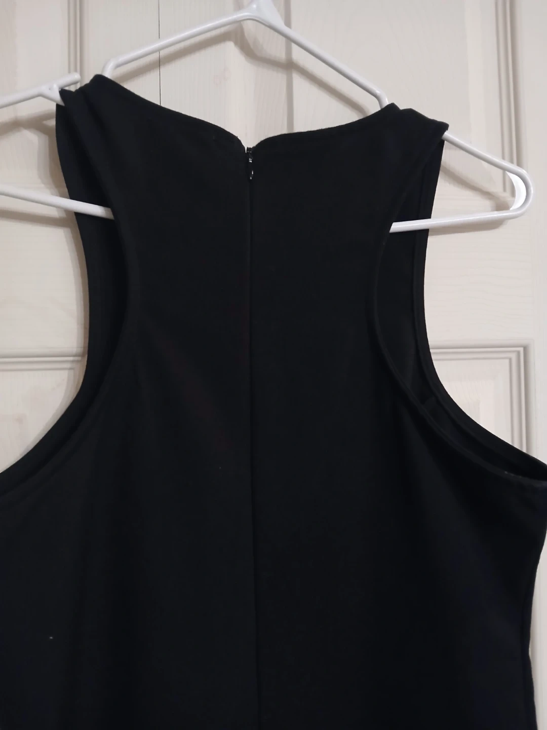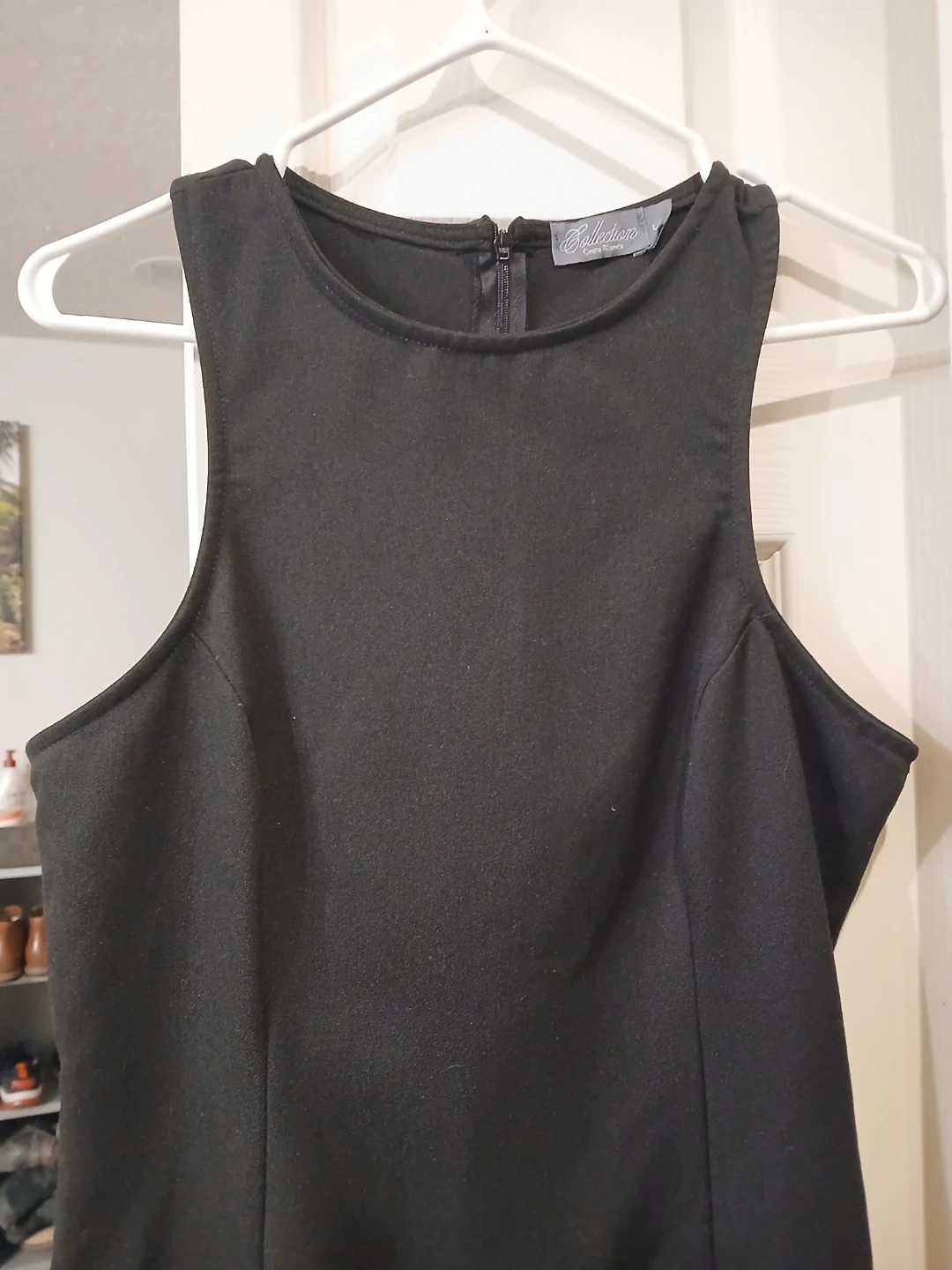 Chic black mini dress featuring a high neckline and sleeveless cut. Tailored silhouette flatters the figure for day or night. Smooth, versatile design that pairs easily with heels or flats. Classic black color for a polished look.