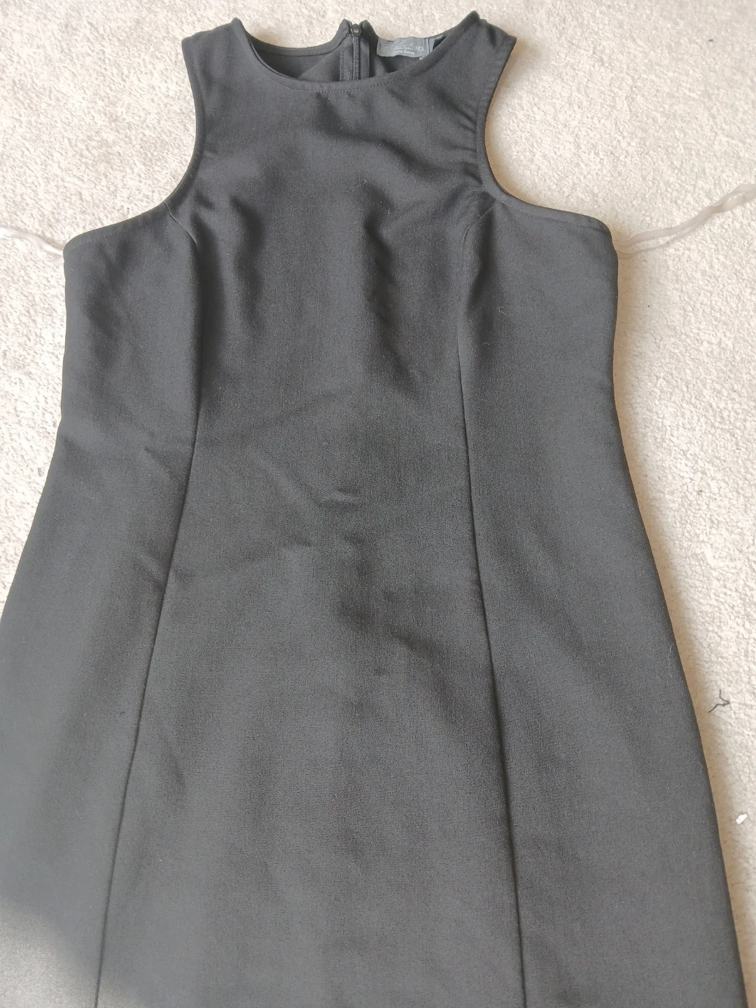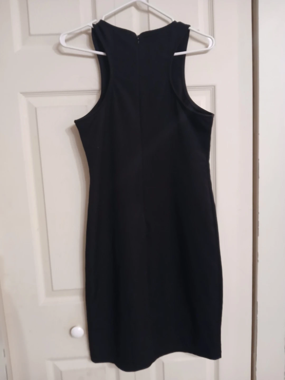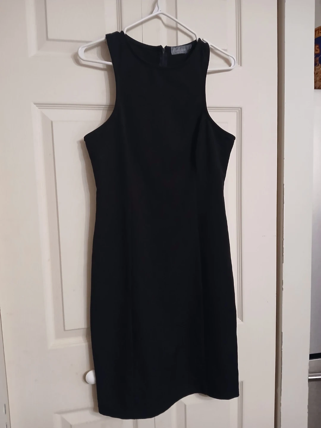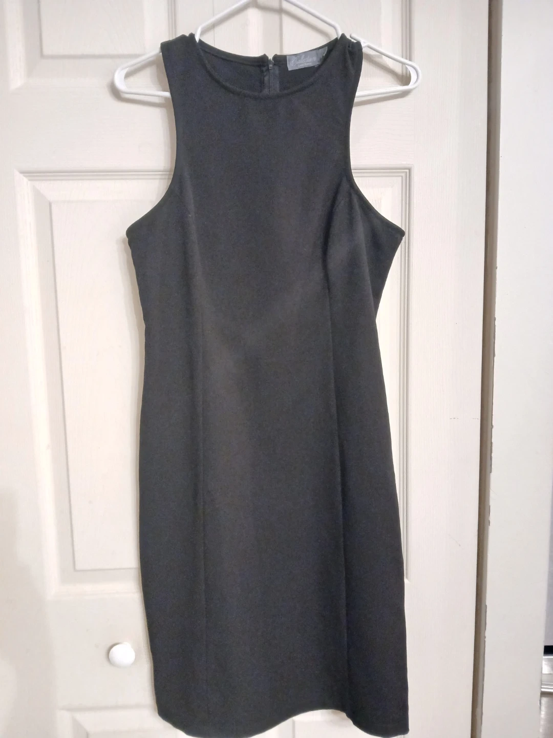 Chic black mini dress featuring a high neckline and sleeveless cut. Tailored silhouette flatters the figure for day or night. Smooth, versatile design that pairs easily with heels or flats. Classic black color for a polished look.