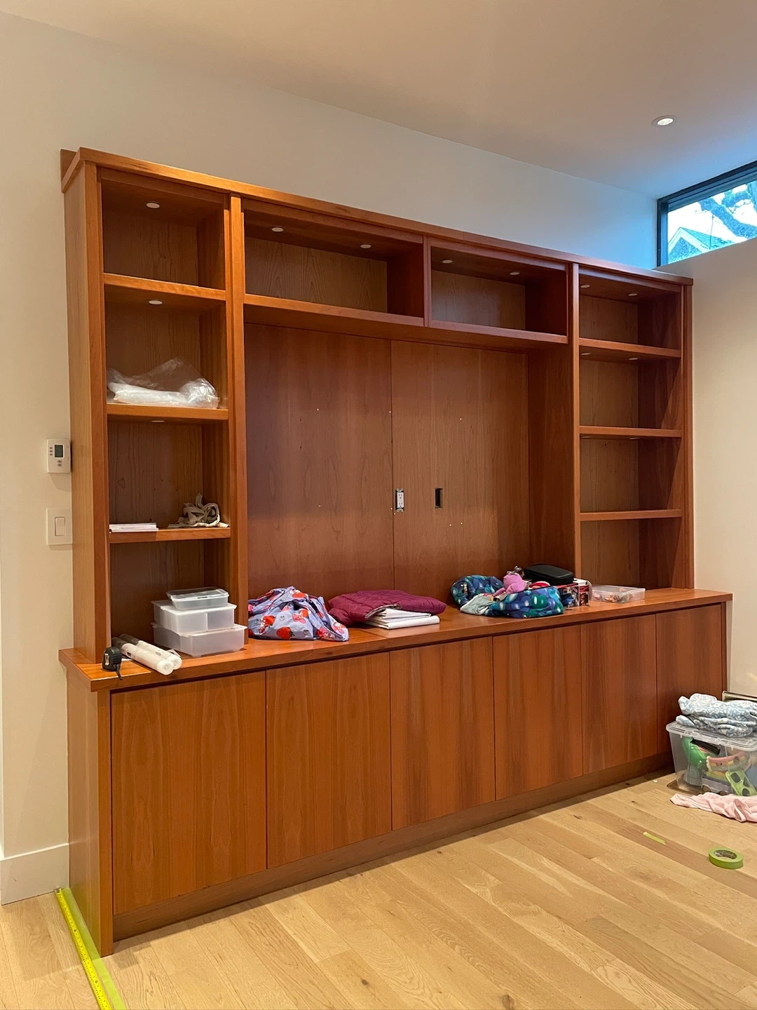 A beautiful, custom-built cherry wood entertainment unit and bookshelf system. It features ample shelving, cabinets below, and integrated lighting. Perfect for organizing media and displaying decor.