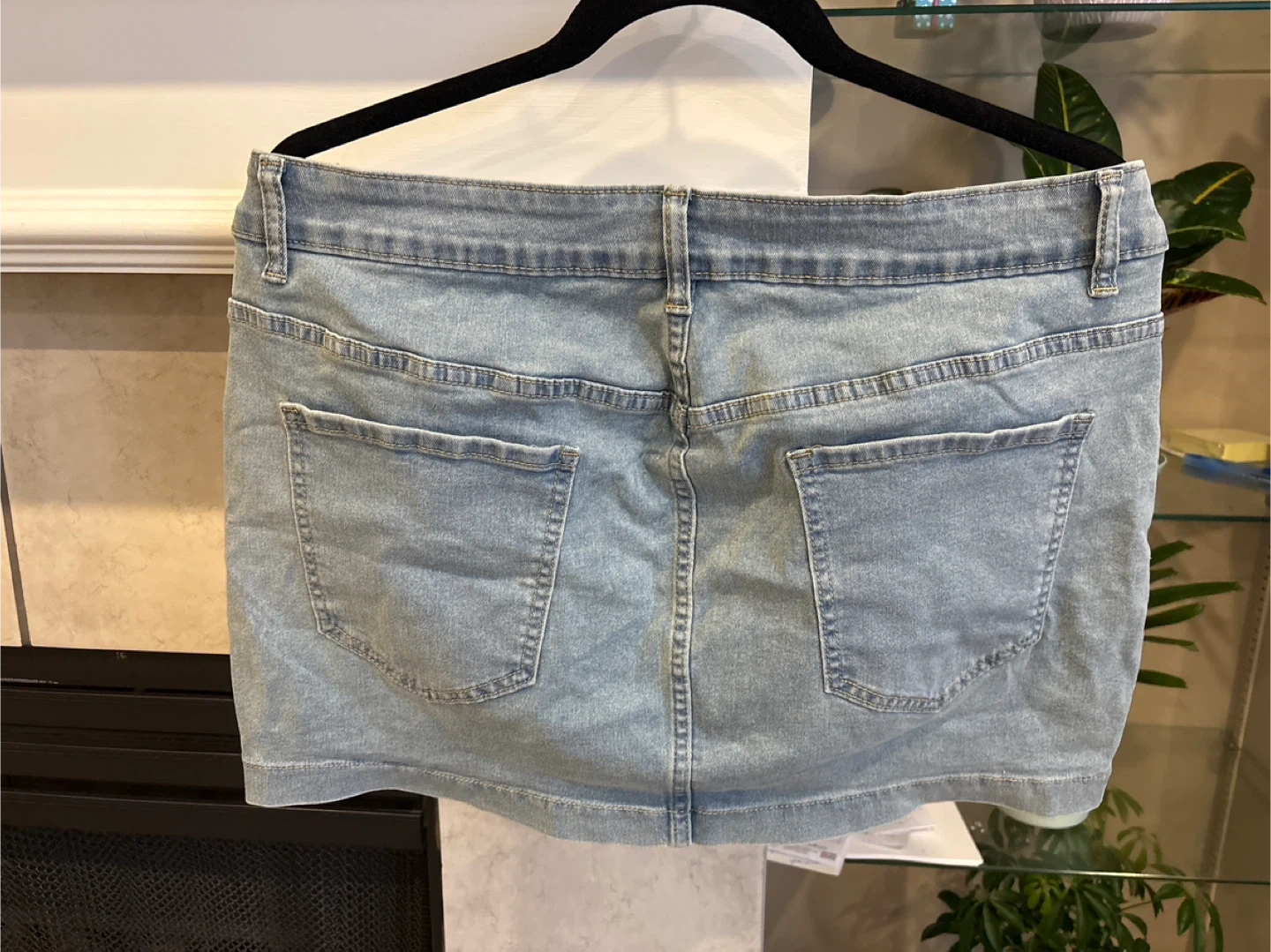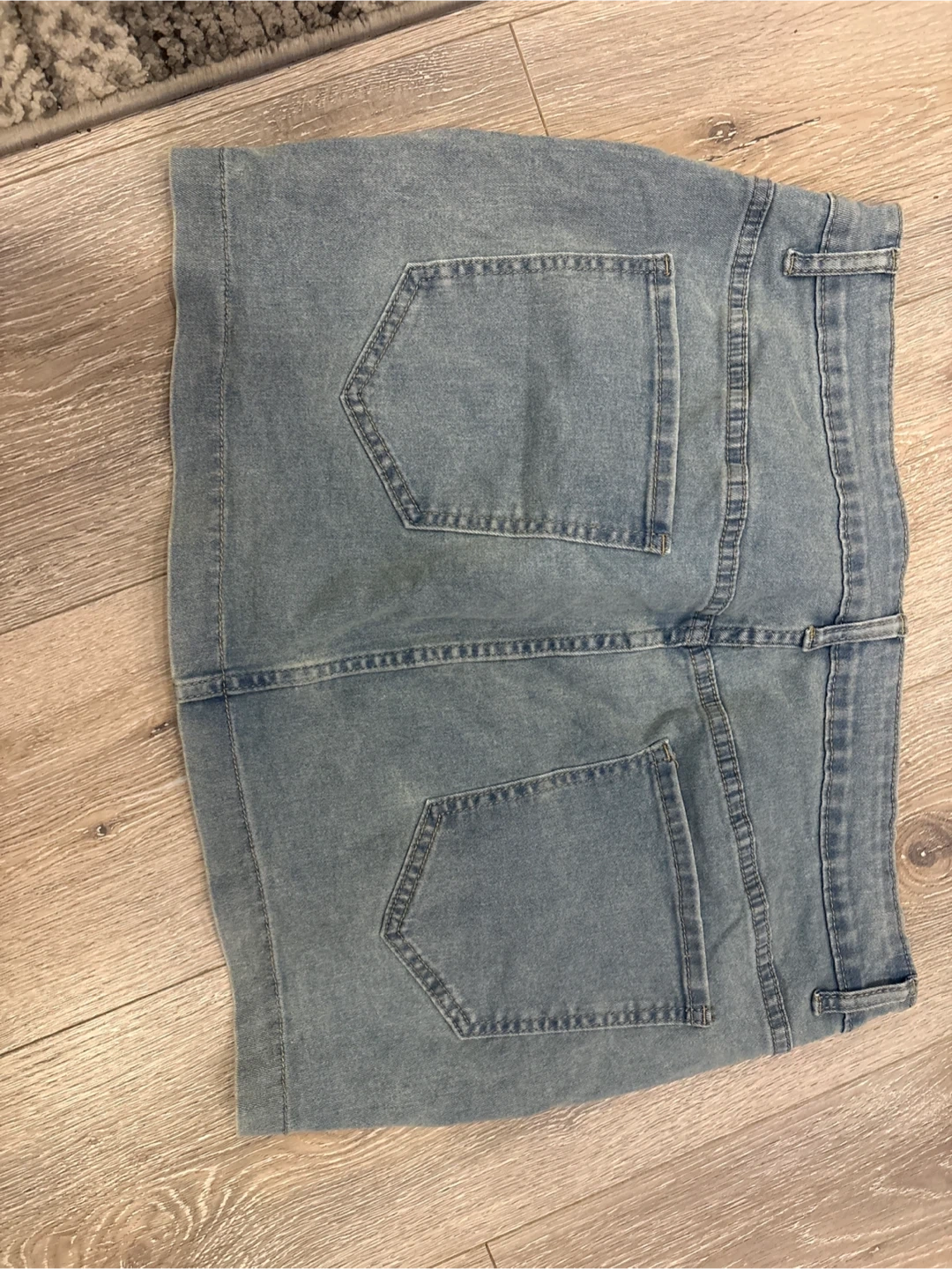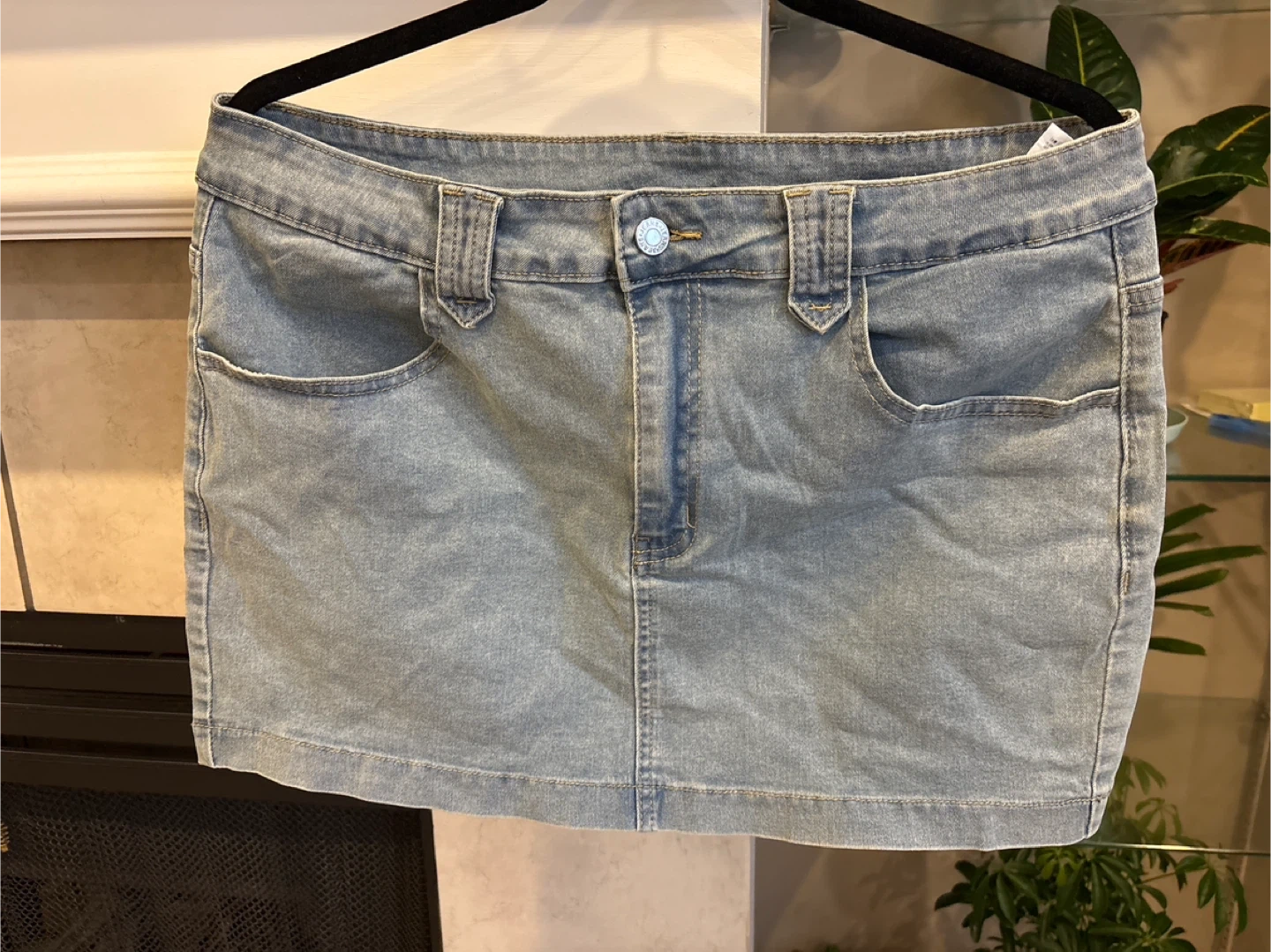 A casual light wash denim mini skirt. It has a classic five-pocket design. This skirt is made of cotton for a comfortable fit. Size 1 XL