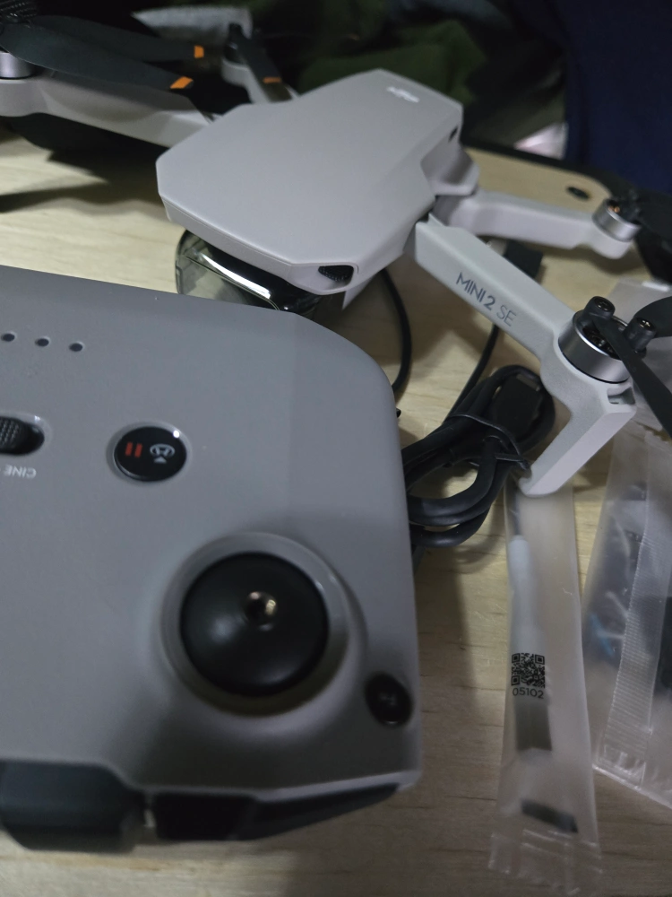 This is a DJI Mini 2 SE drone with its controller and bag and several accessories. including extra propellers and charger and 3 batteries. It's a great drone for capturing aerial photos and videos. It's compact and easy to fly! used only a few times since purchase.