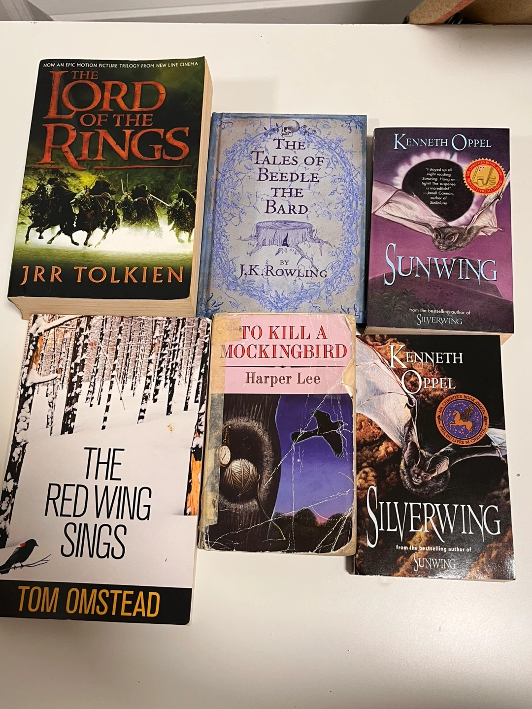 This lot includes 'The Lord of the Rings' by JRR Tolkien, 'The Tales of Beedle the Bard' by J.K. Rowling, 'Sunwing' and 'Silverwing' by Kenneth Oppel, 'The Red Wing Sings' by Tom Olmstead, and 'To Kill a Mockingbird' by Harper Lee.