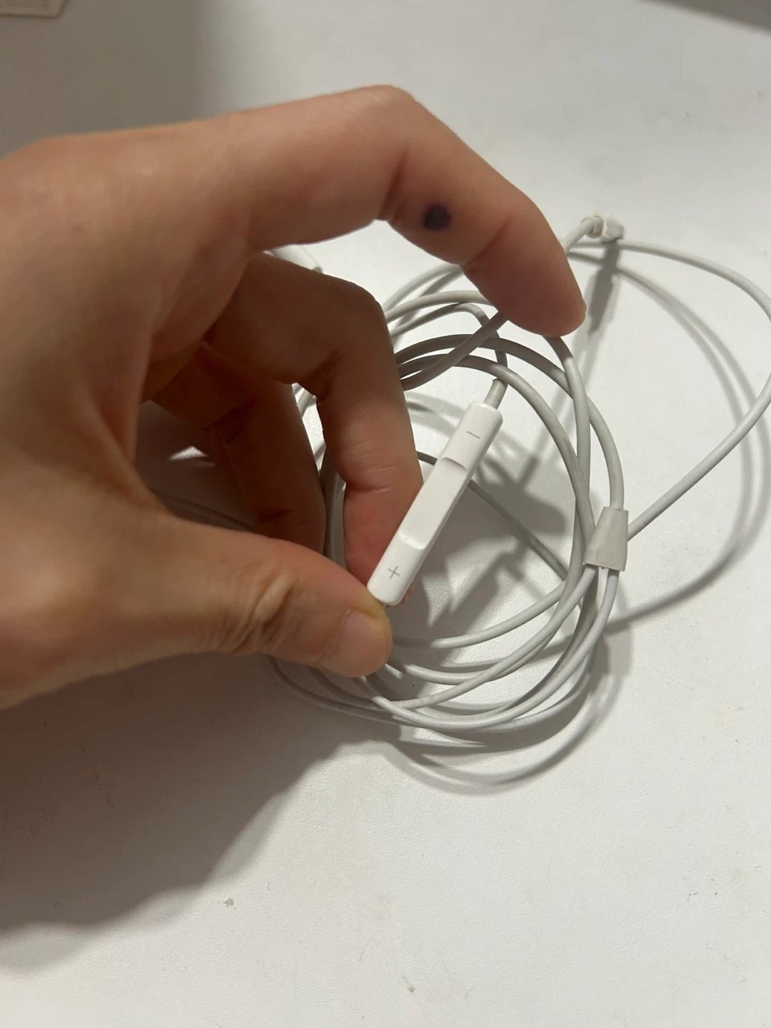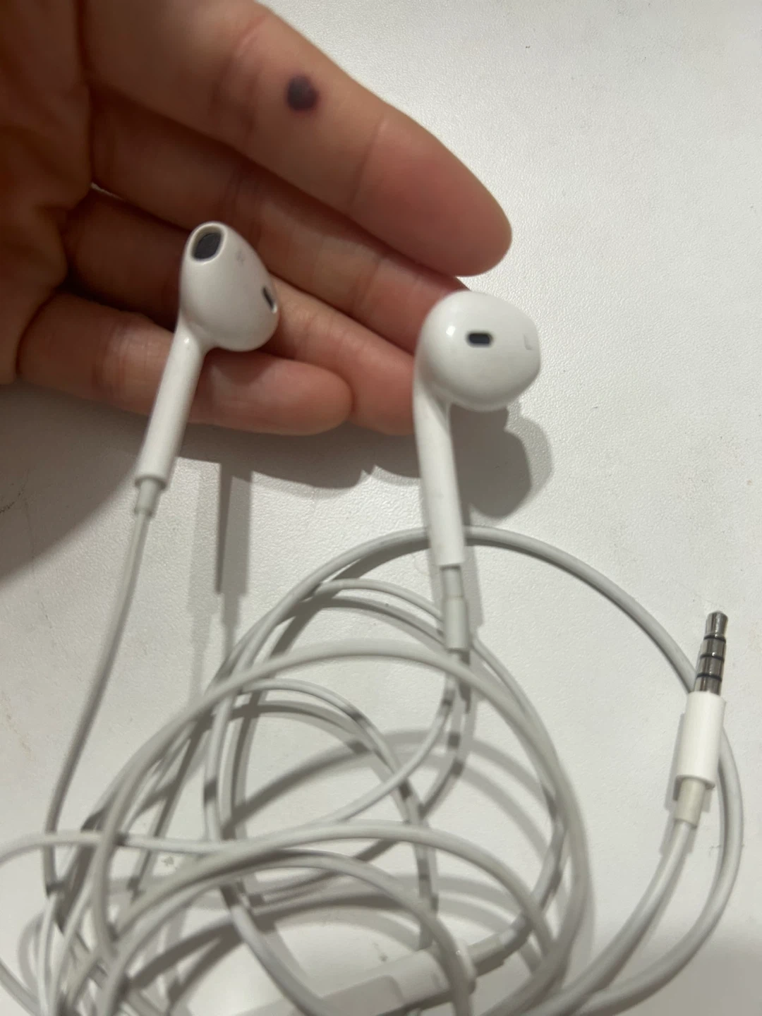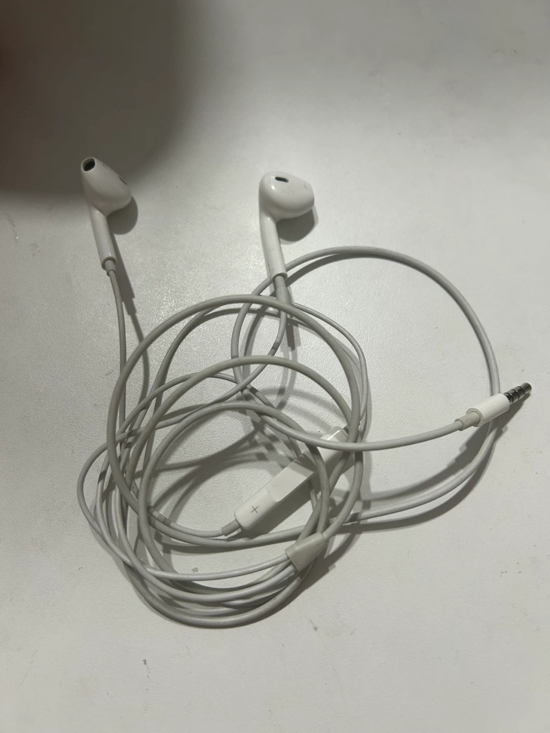 White Apple EarPods with built-in remote and microphone. These earphones offer a standard 3.5mm headphone plug. They're great for listening to music and taking calls on the go!