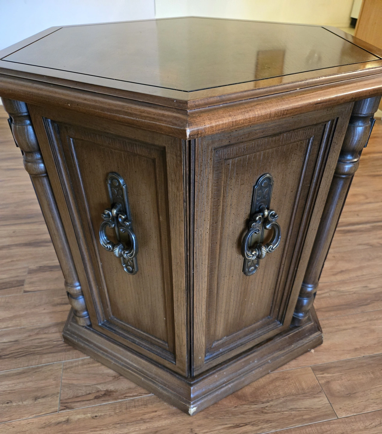 • 2 Hexagonal Storage End Tables: Featuring stunning cathedral-style recessed panels and original antiqued brass ring-pull hardware. The interior cabinets provide deep, functional storage.