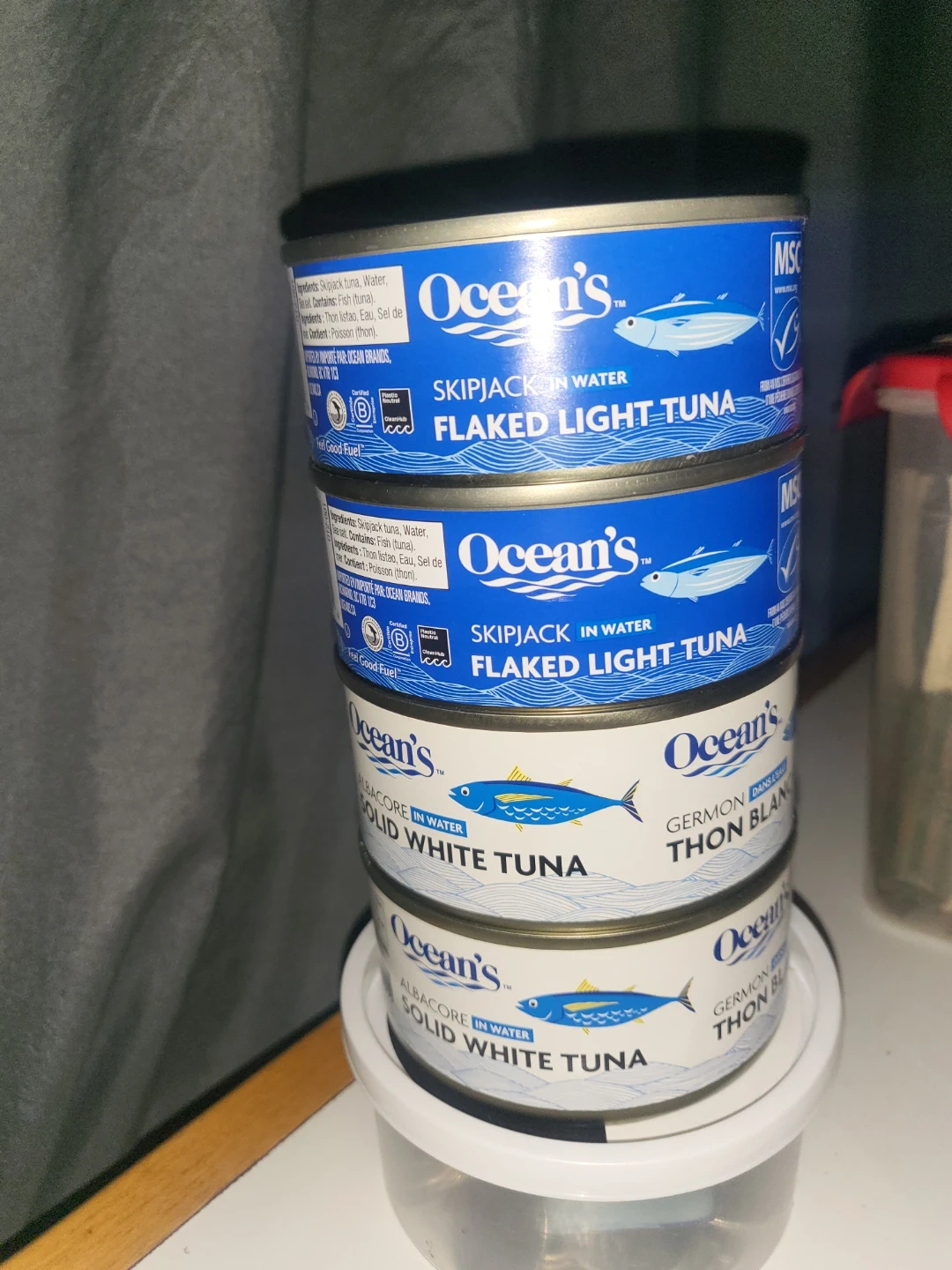Four cans of Ocean's tuna. Two cans are skipjack flaked light tuna in water and two are albacore solid white tuna in water. These are good for quick meals.