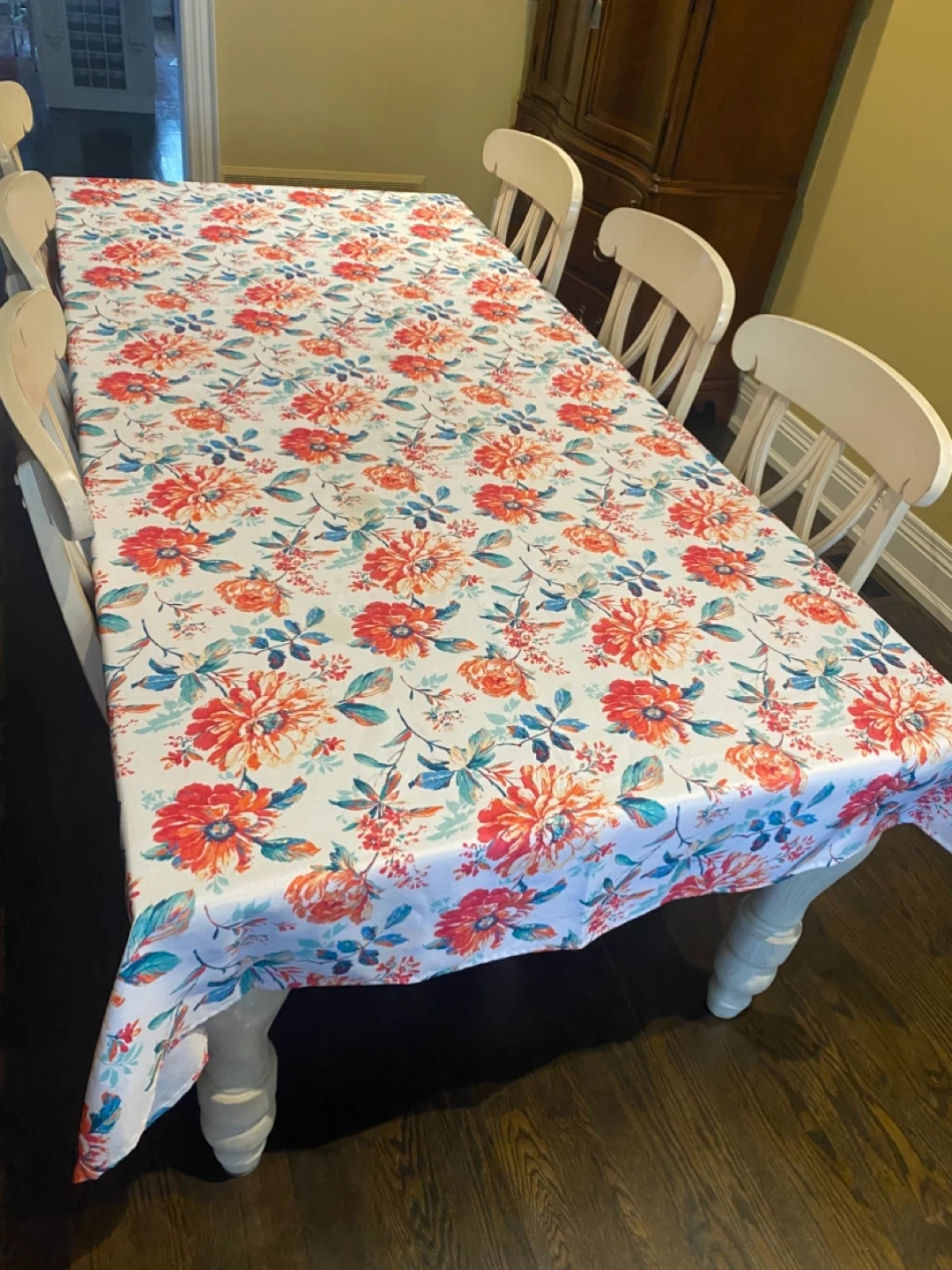 Outdoor Brighten up your dining room with this colourful floral tablecloth. It features a vibrant pattern with reds, oranges, and blues on a white background. Easy to clean and protects your table.