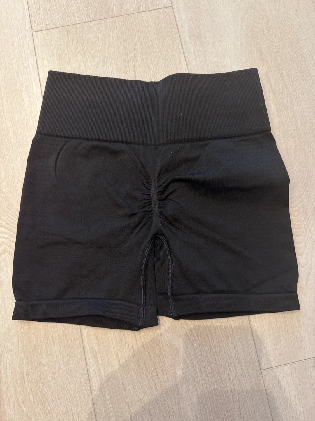 Totally new Black seamless shorts from Gymshark. These shorts feature a ruched detail at the back and a high-waisted fit. Material is stretchy and breathable.