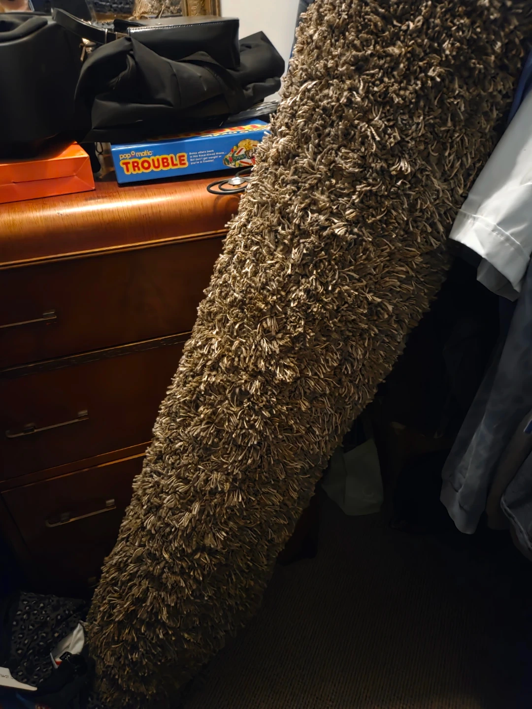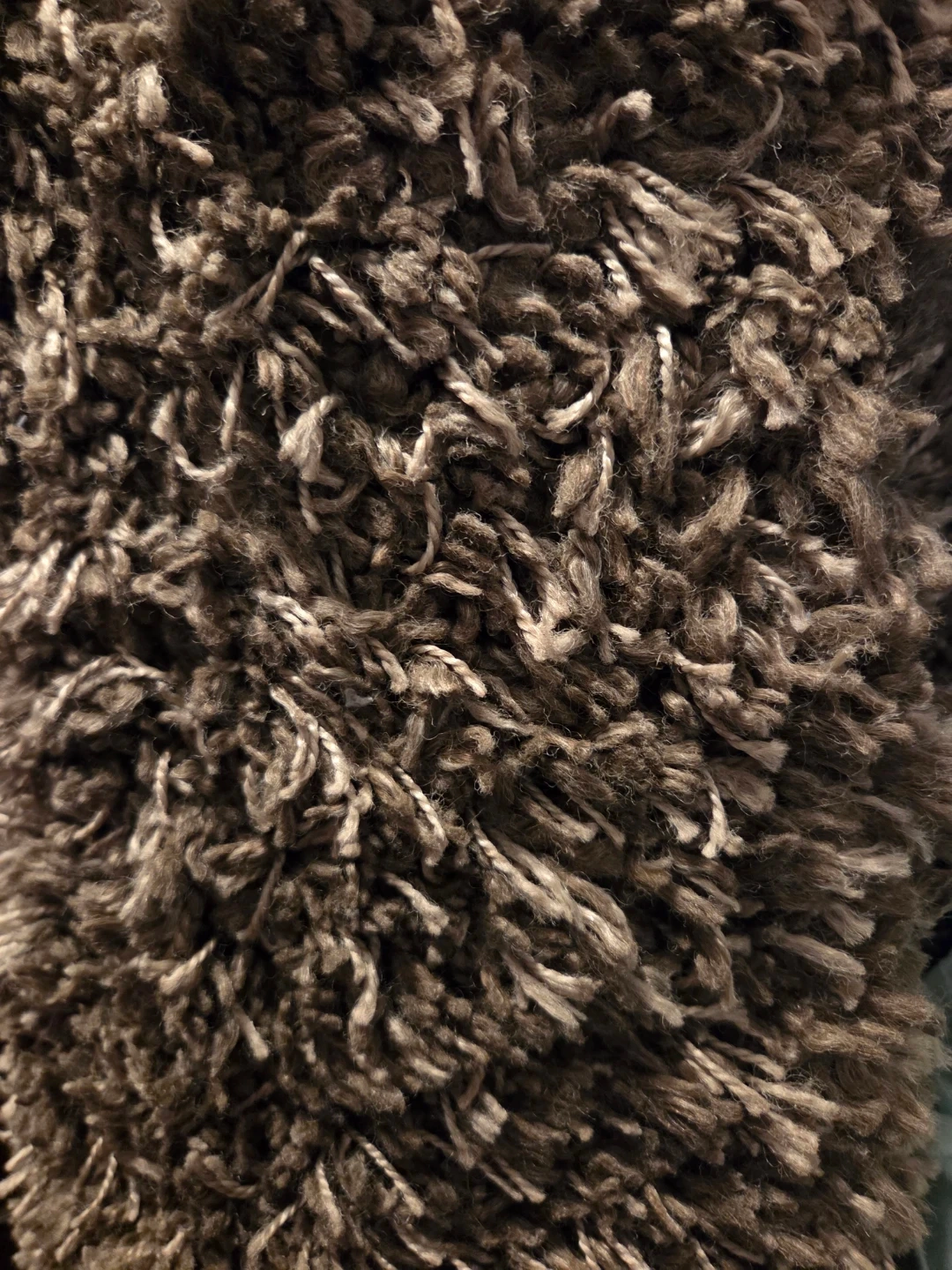 Cozy shag rug in a rich brown colour. It's soft and textured, perfect for adding warmth to any room. The shaggy pile is deep and inviting! A great way to make a space feel more comfortable. From Costco..