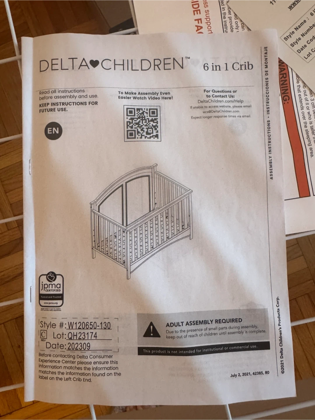 I'm selling a Delta Children 6-in-1 Crib. There are some signs of wear, as shown in the pictures. The style number is W120650-130 and the lot number is QH23174. Adult assembly is required. Has small scratches from camera mount. Mattress not included.