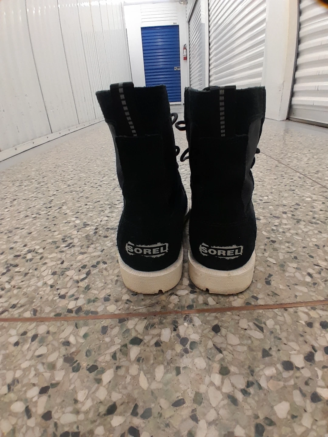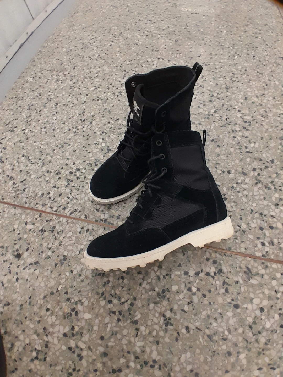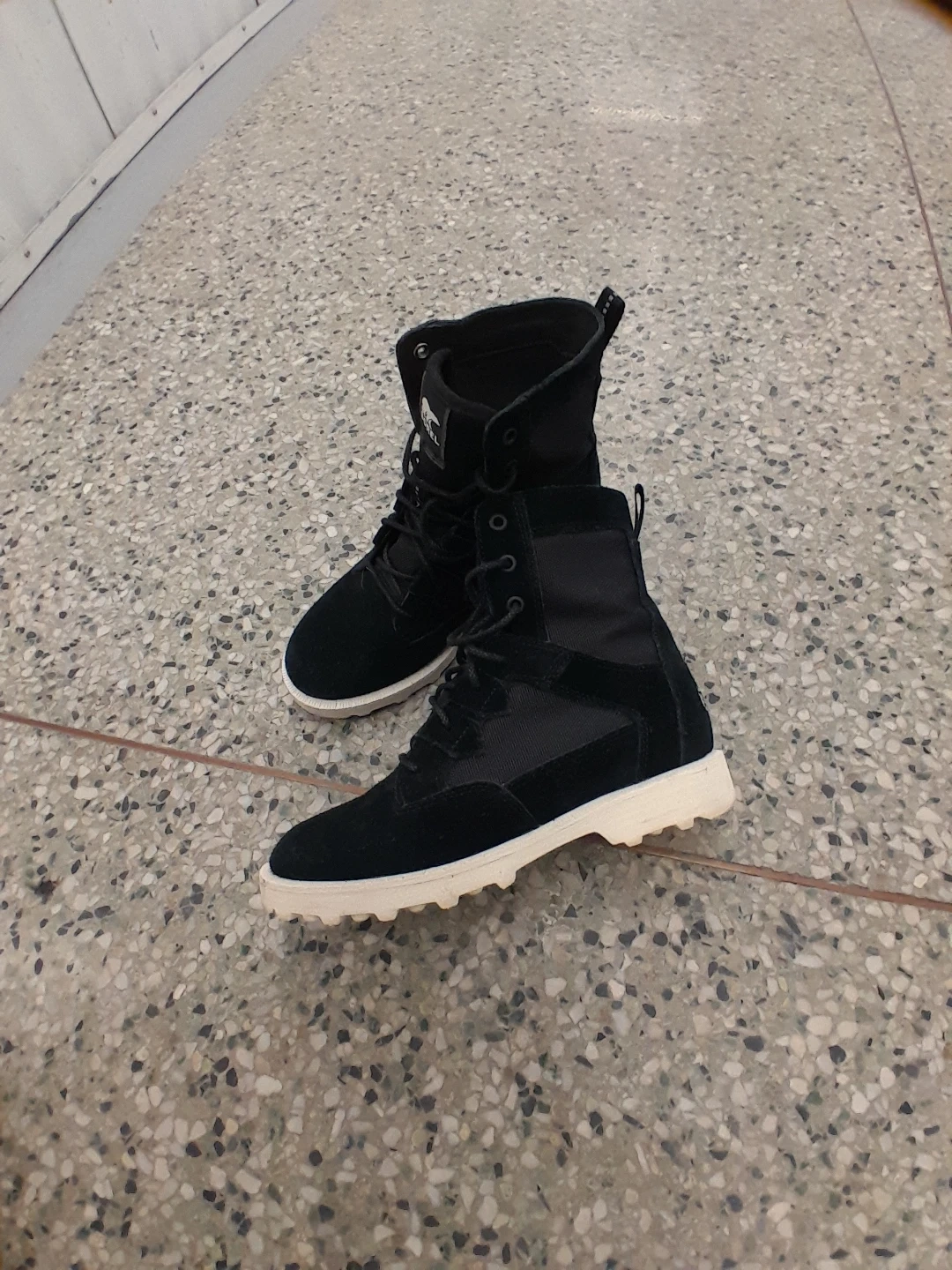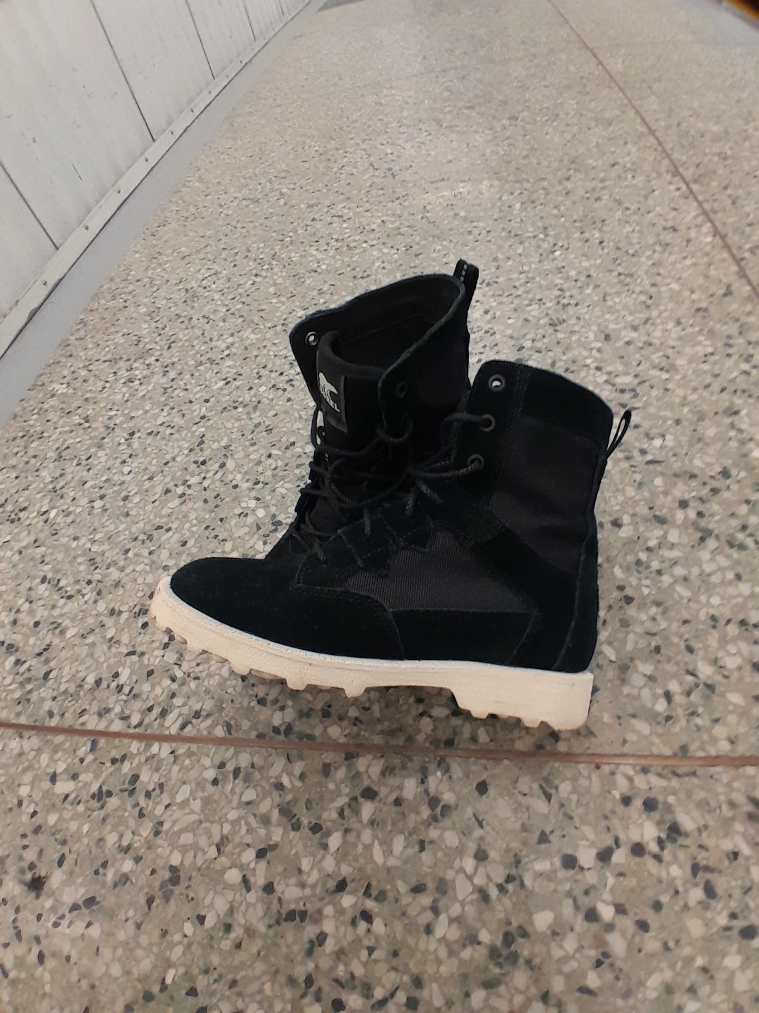 Sorel black winter boots. These boots are designed for warmth and traction in cold weather. They feature a lace-up closure for a secure fit women's size 7.5