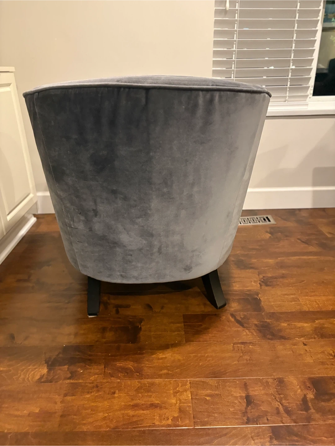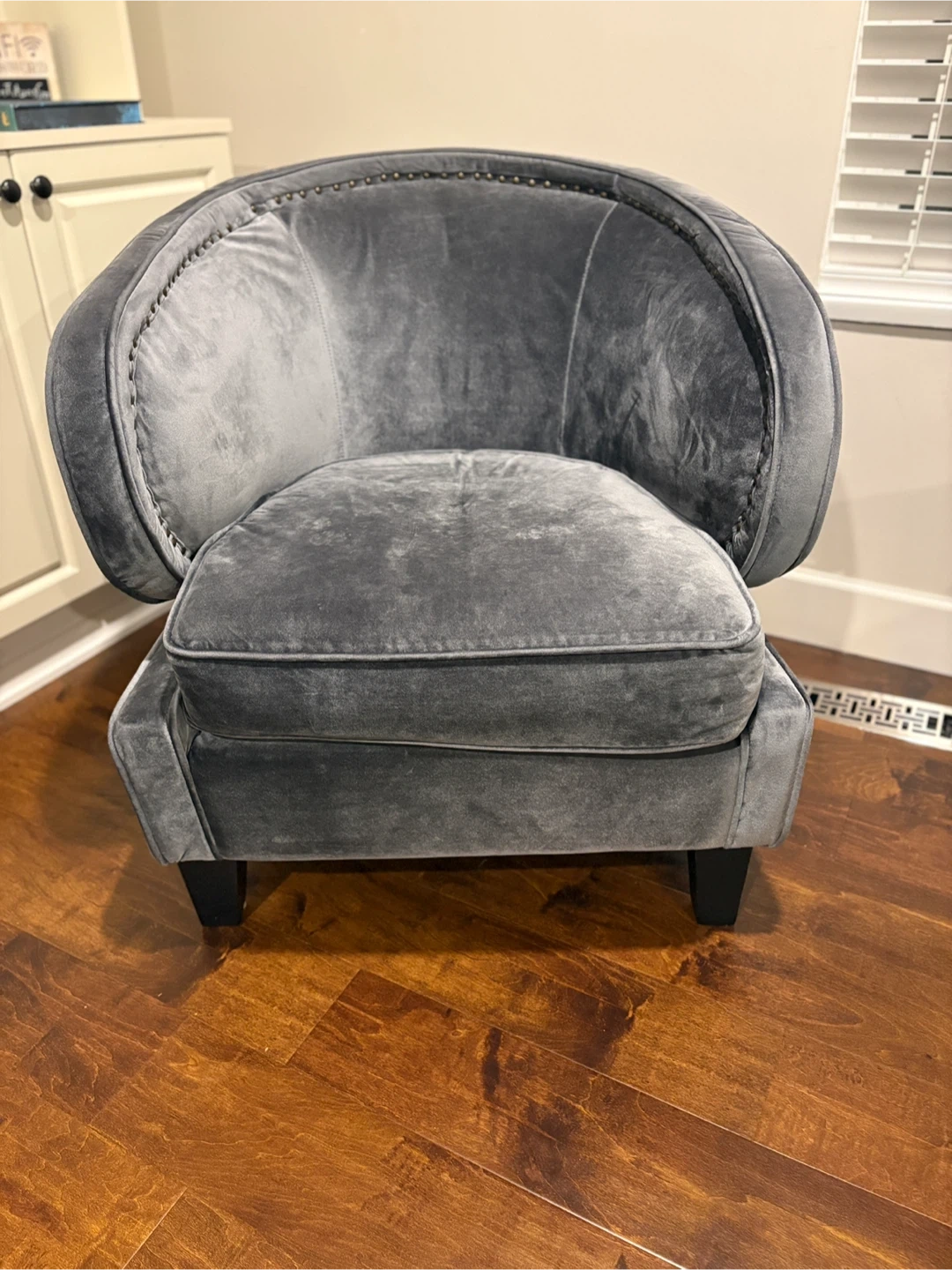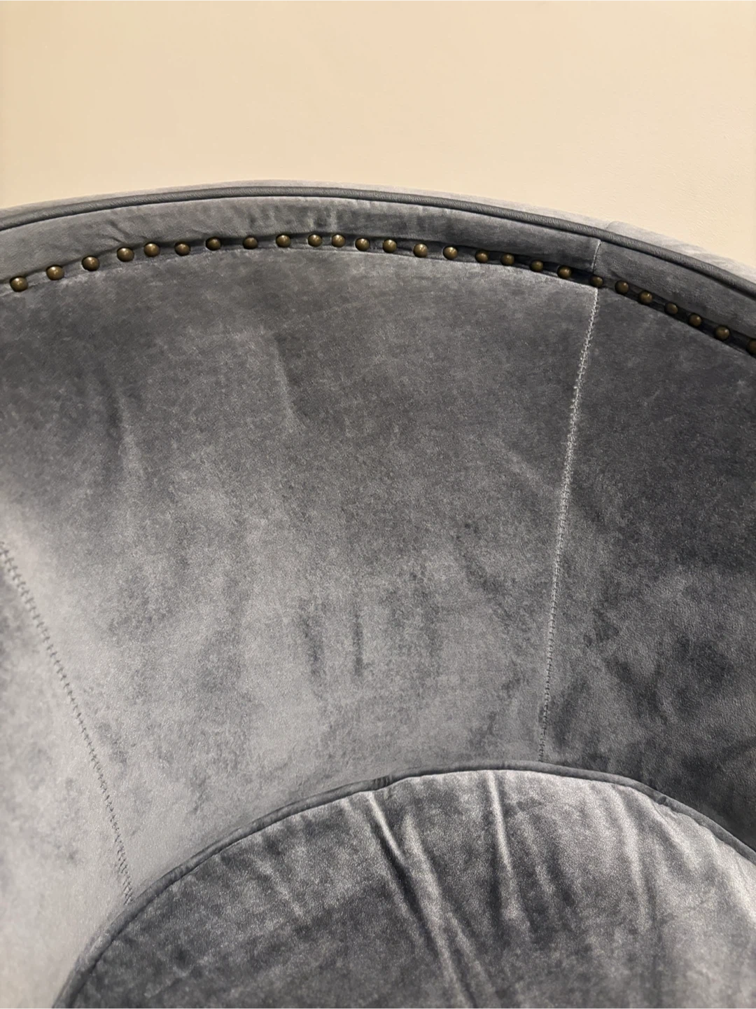 This stylish accent chair is upholstered in soft grey velvet. It features decorative brass nailhead trim along the curved backrest. The chair's compact size makes it a versatile addition to any room.