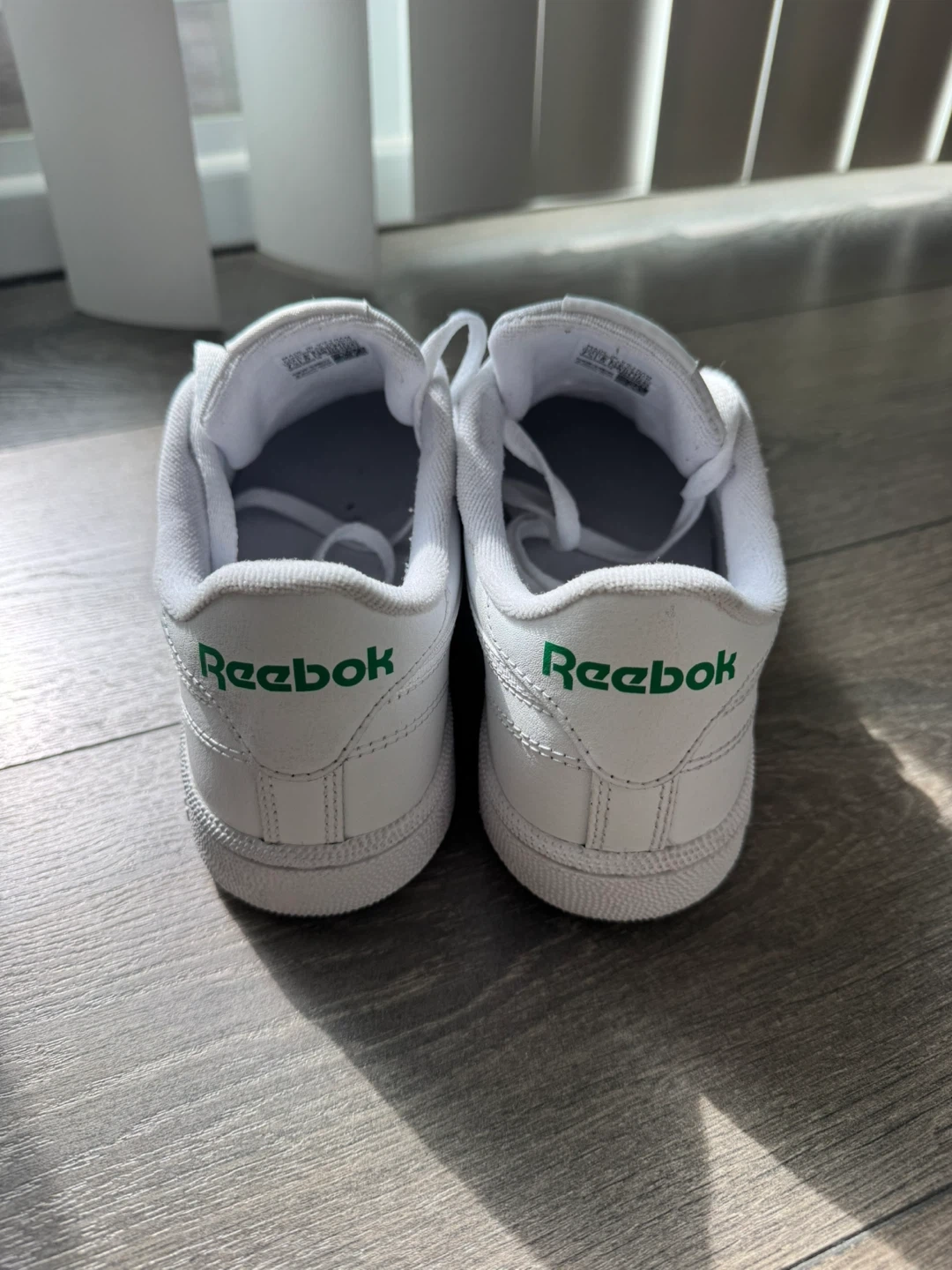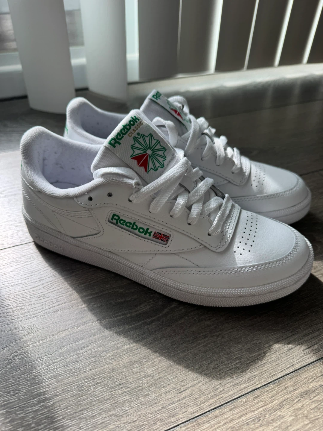 Classic white leather sneakers with green Reebok branding. Size 7.5 US women's, 5 UK, 38 EUR, 24.5 CM. Made in Vietnam, manufactured 12/23. Perfect for everyday wear!
