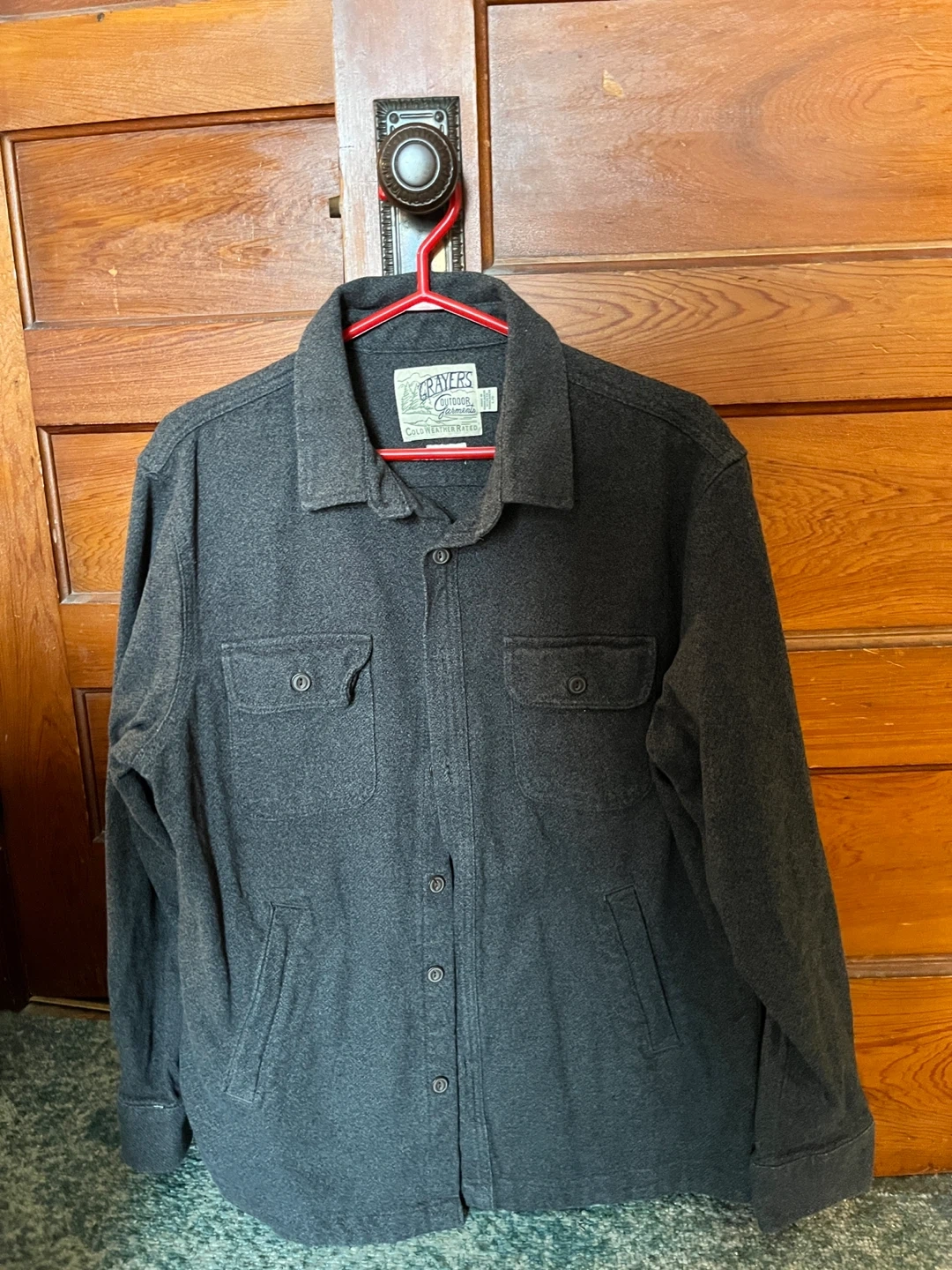 This is a dark grey Grayers Outdoor shirt jacket. It features two chest pockets and two hand pockets. It's rated for cold weather.